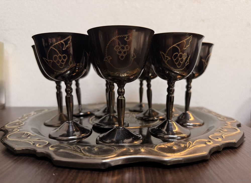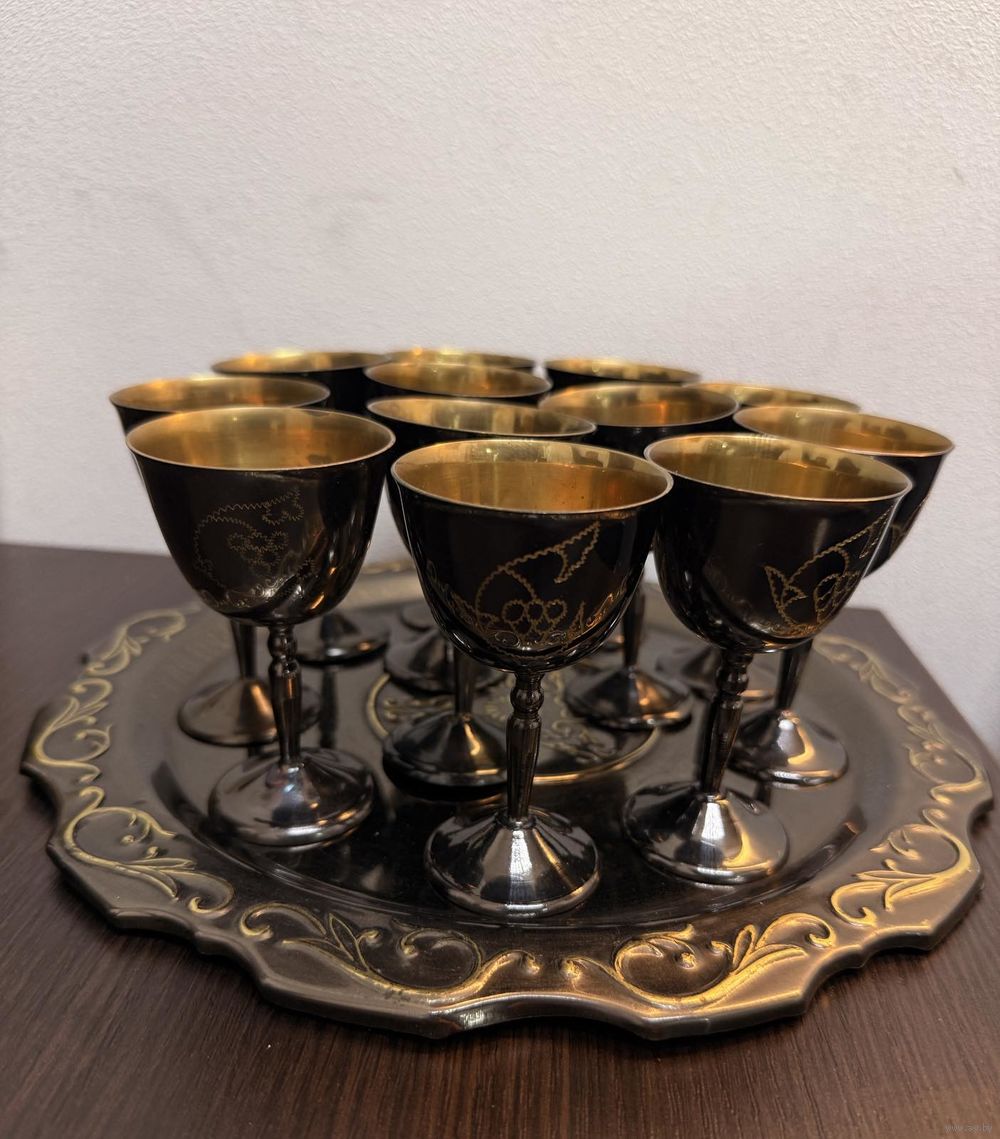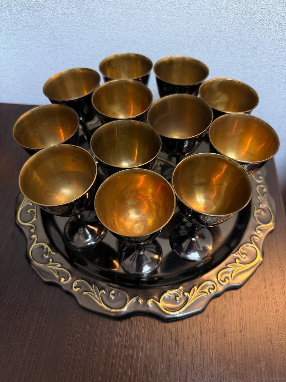 Винтажный набор из 12 рюмок и подноса из латуни с гравировкой , состояние хорошее , незначительные следы бытования , хорошо подойдет в визе подарка или презента , а так же можно принять за столом большую компанию из 12 человек и удивить их подачей горячительных напитков . размер высота рюмки 9.5 см ширина 5.5 объем 50 мл . диаметр подноса 28 см вес 1300 грамм .