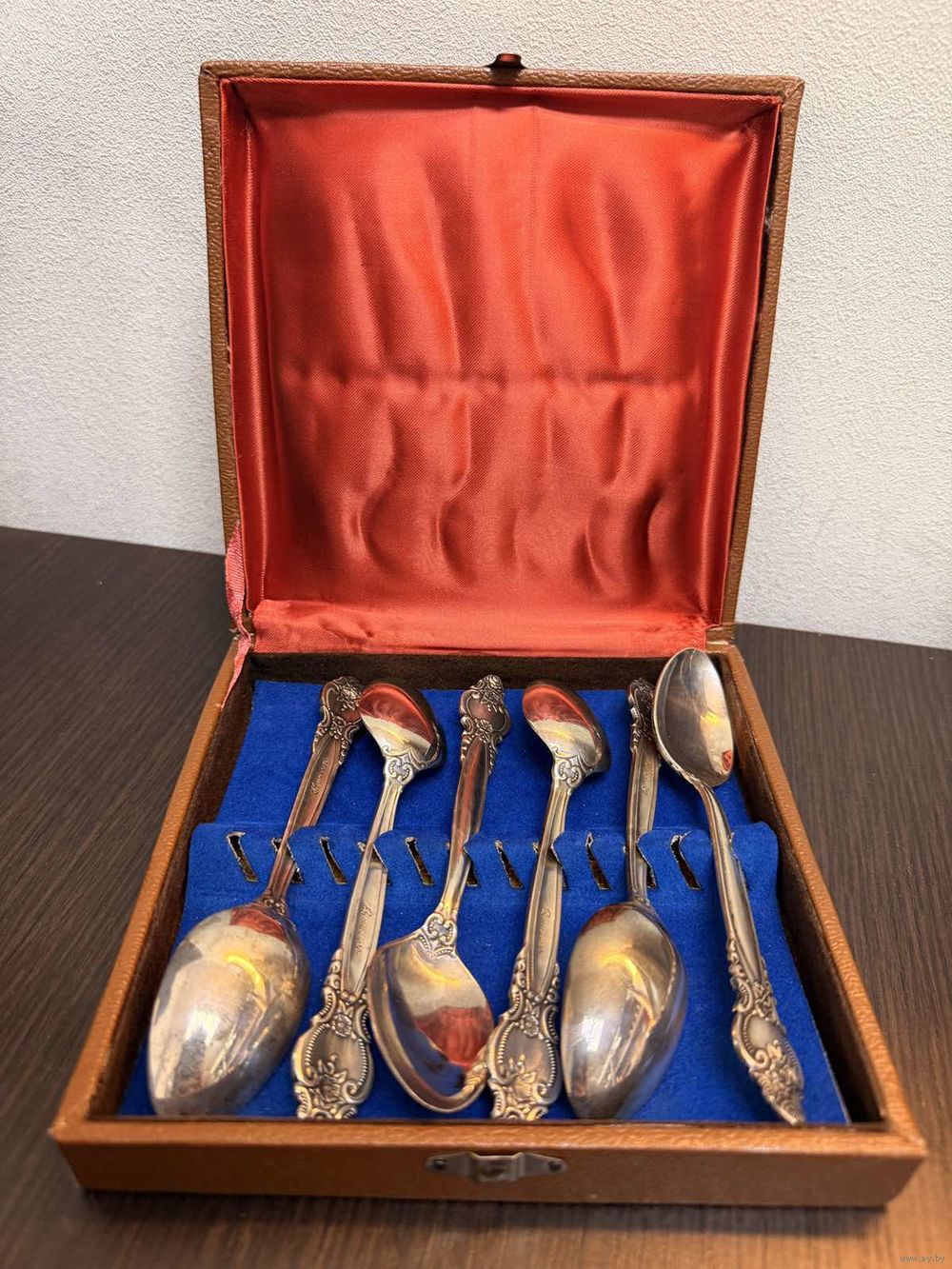 Винтажный набор из шести чайных ложек из мельхиора очень красиво на ручках ложек выполнен растительный декор предположительно с серебрением , в оригинальной коробке , умеренные следы бытования состояние хорошее , хорошо подойдут в виде подарка или презента ,