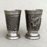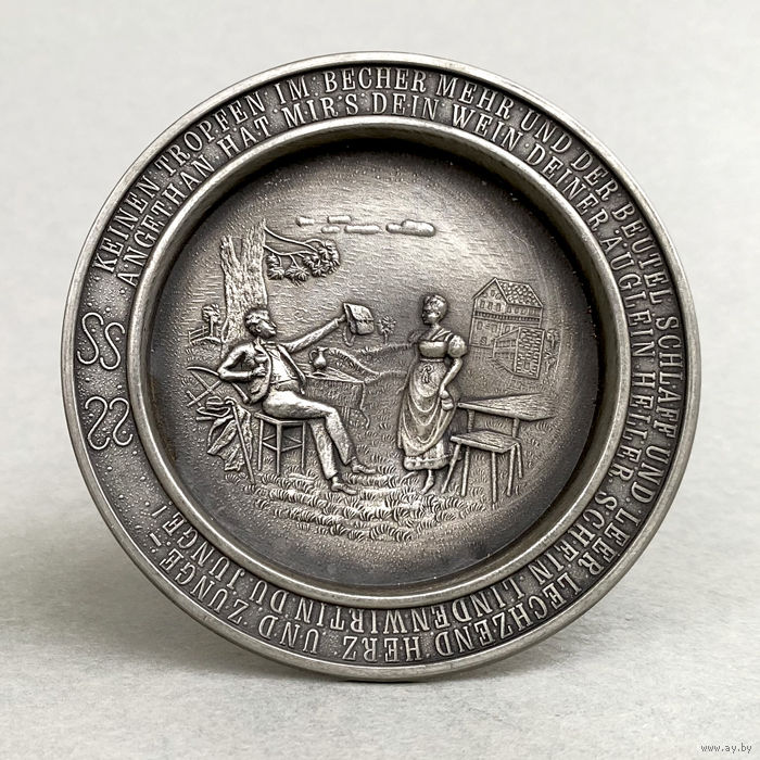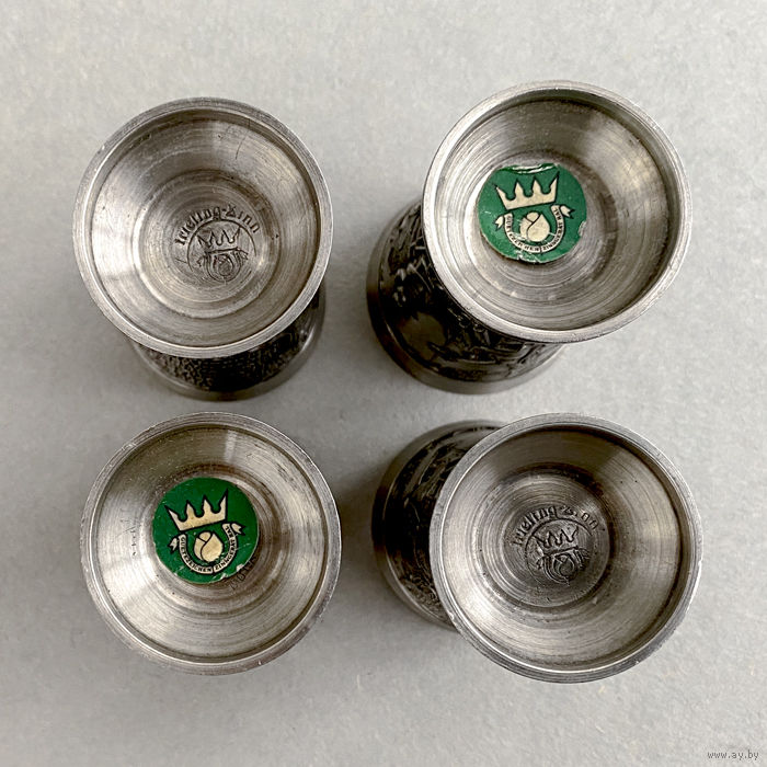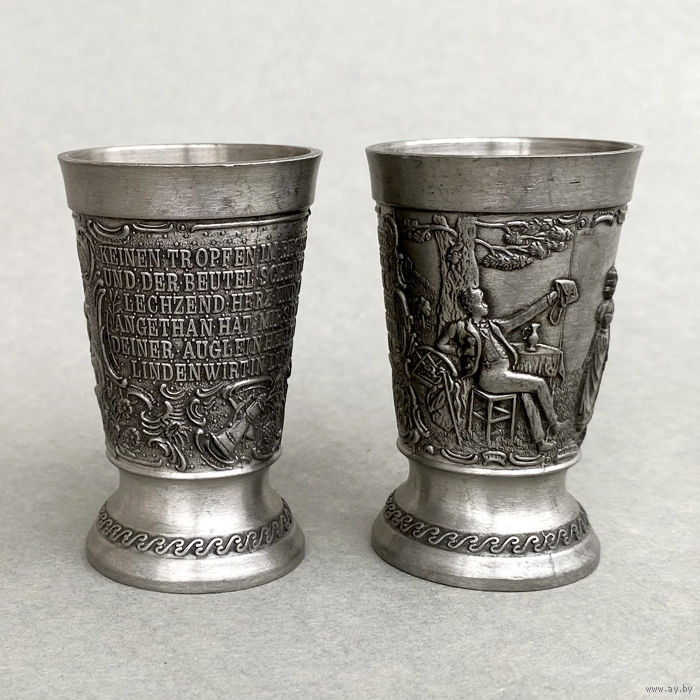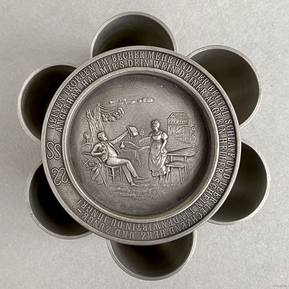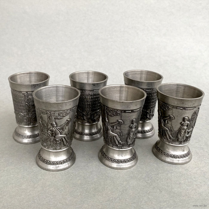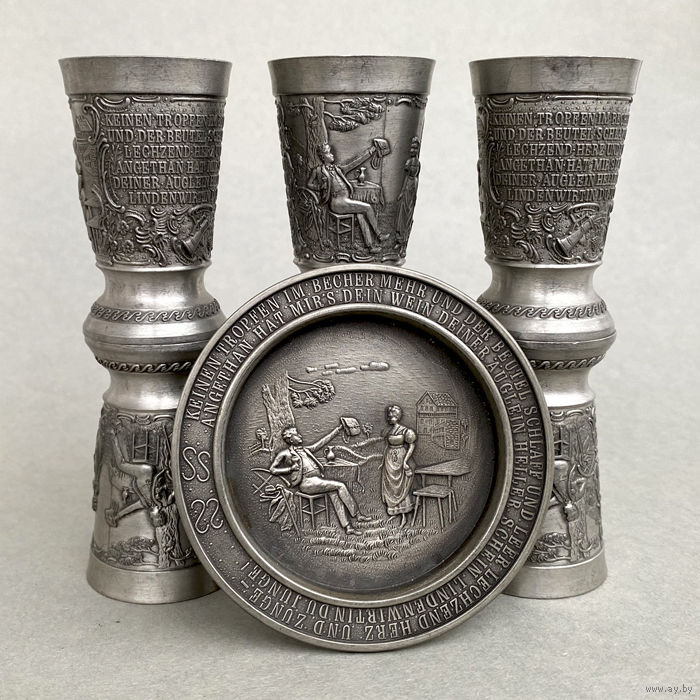 Оловянные рюмки / стопки, Frieling zinn, Германия. Барельеф с изображением сценки из застольной немецкой песни "Хозяйка липовой рощи". Шесть штук. Высота 6,5 см. Тарелочка одна, диаметр 8,7 см. Состояние отличное.