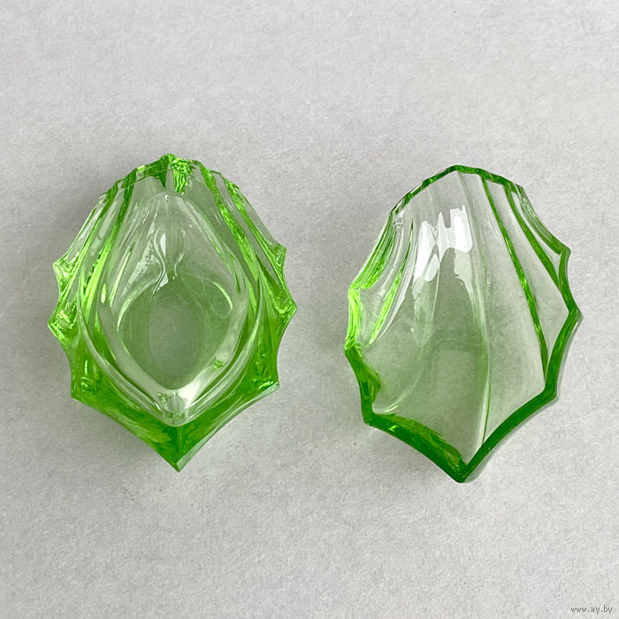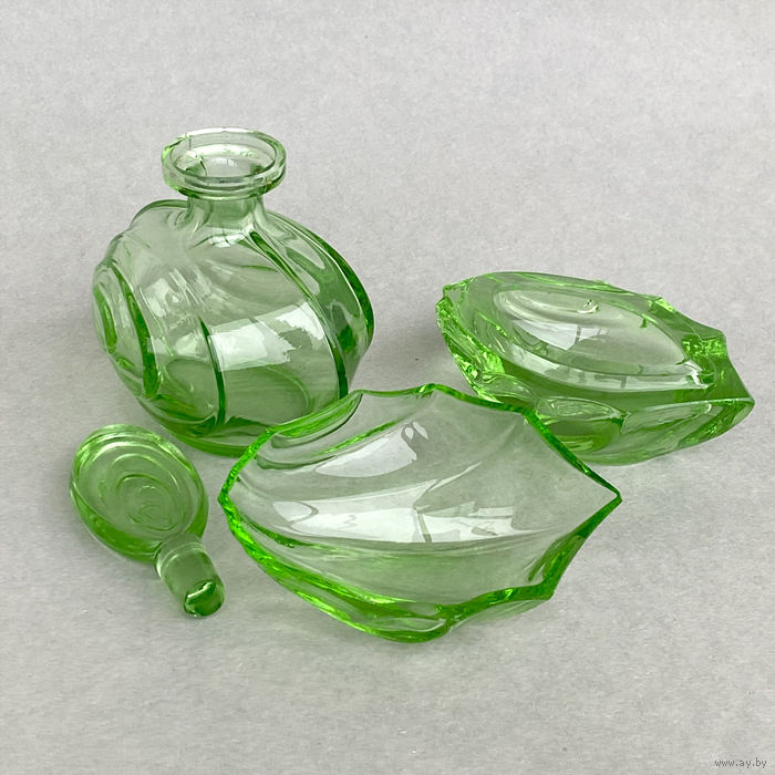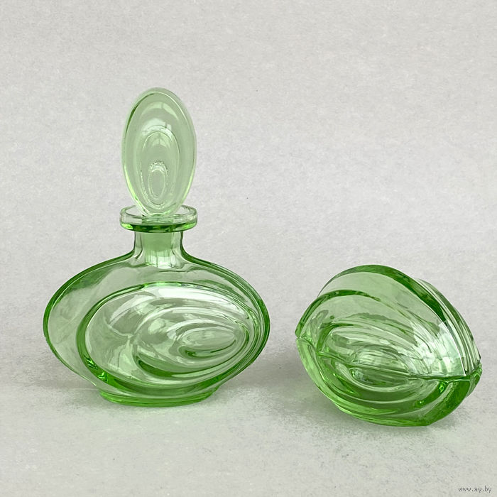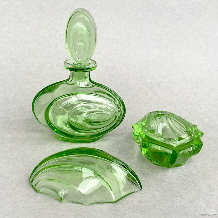 Парфюмерный набор "Морской". Изумрудное стекло. Редкий. Стеклозавод "Неман" 1950-е годы. Высота флакона - 14 см, высота шкатулки - 6 см