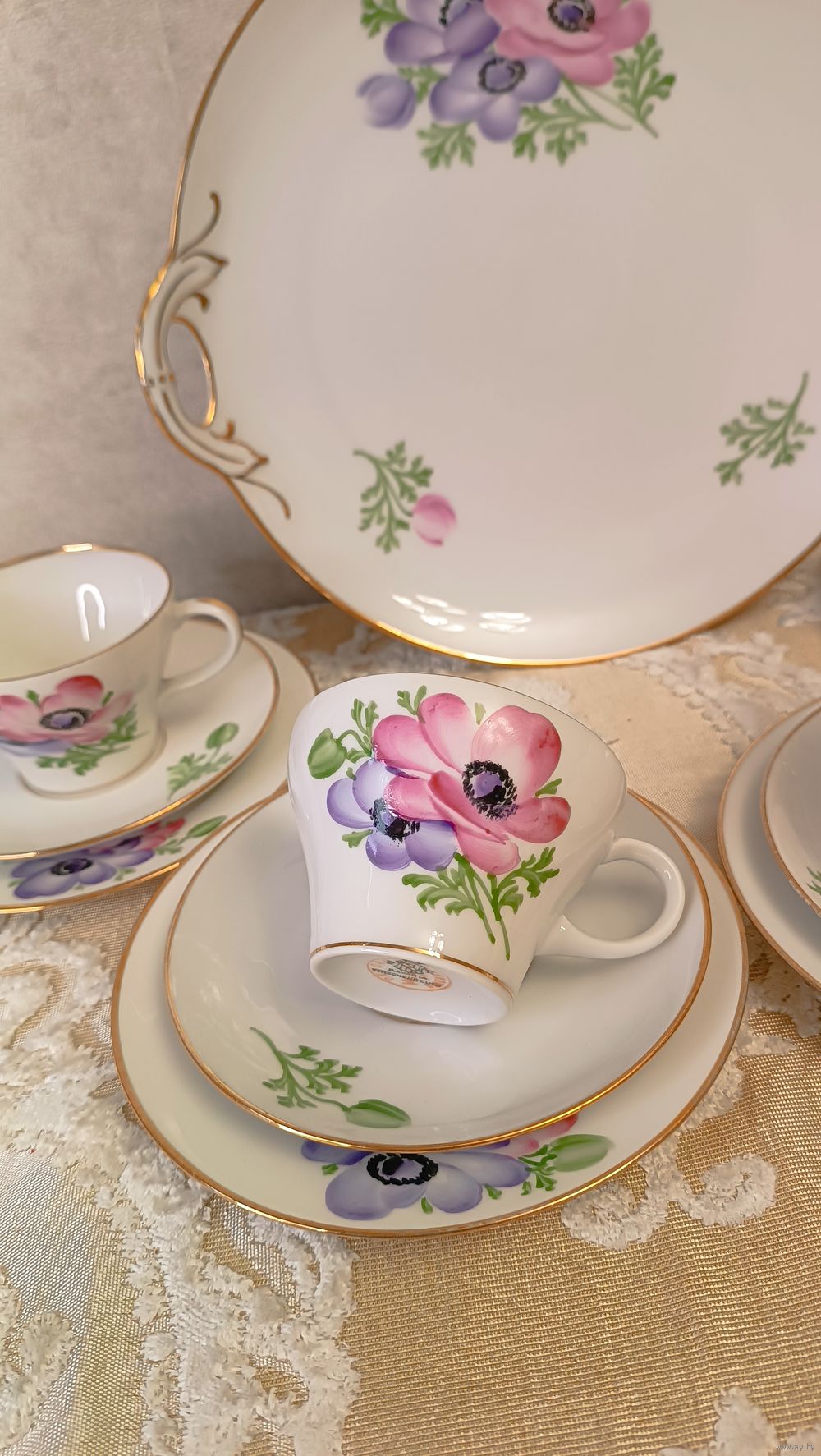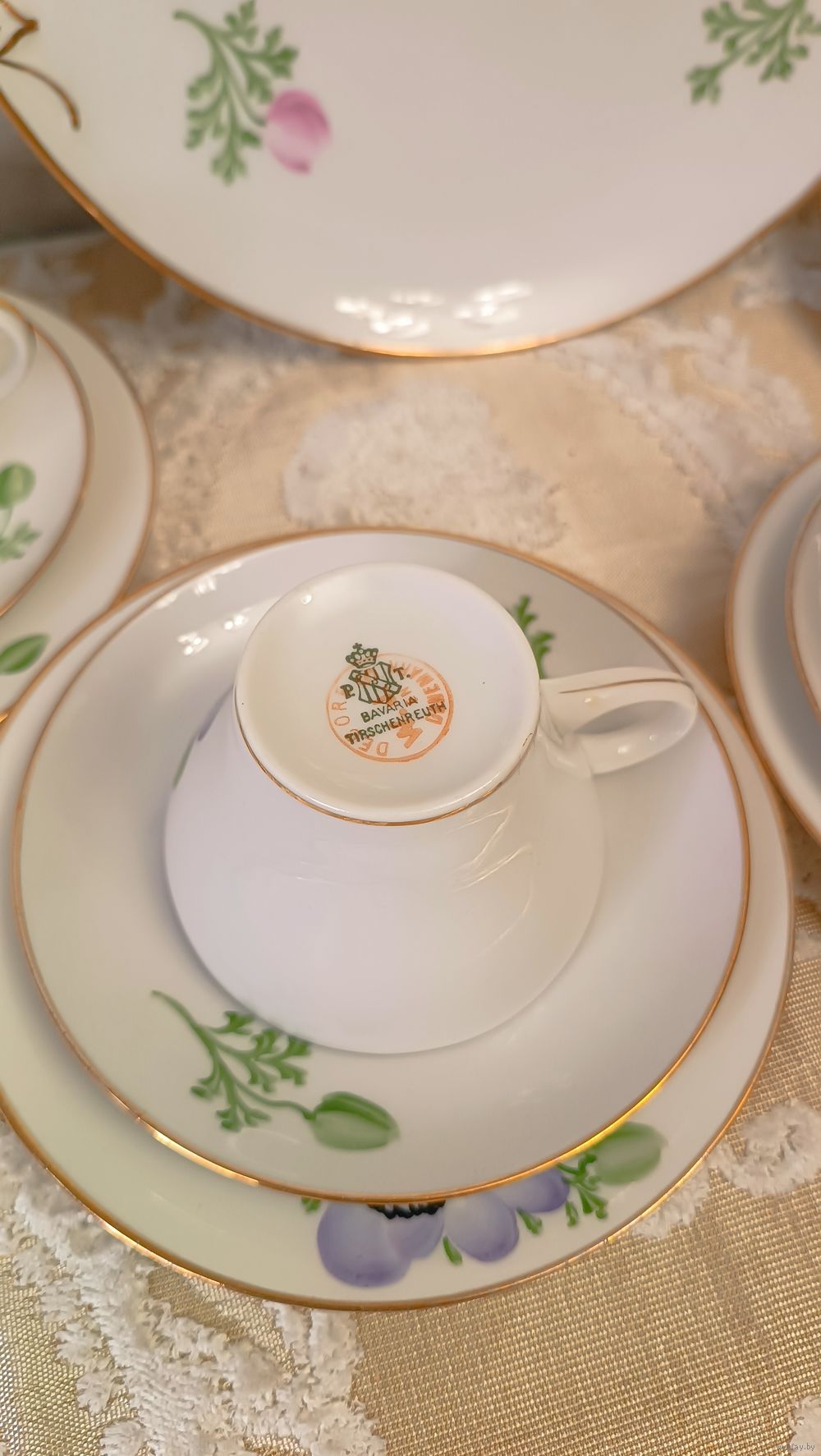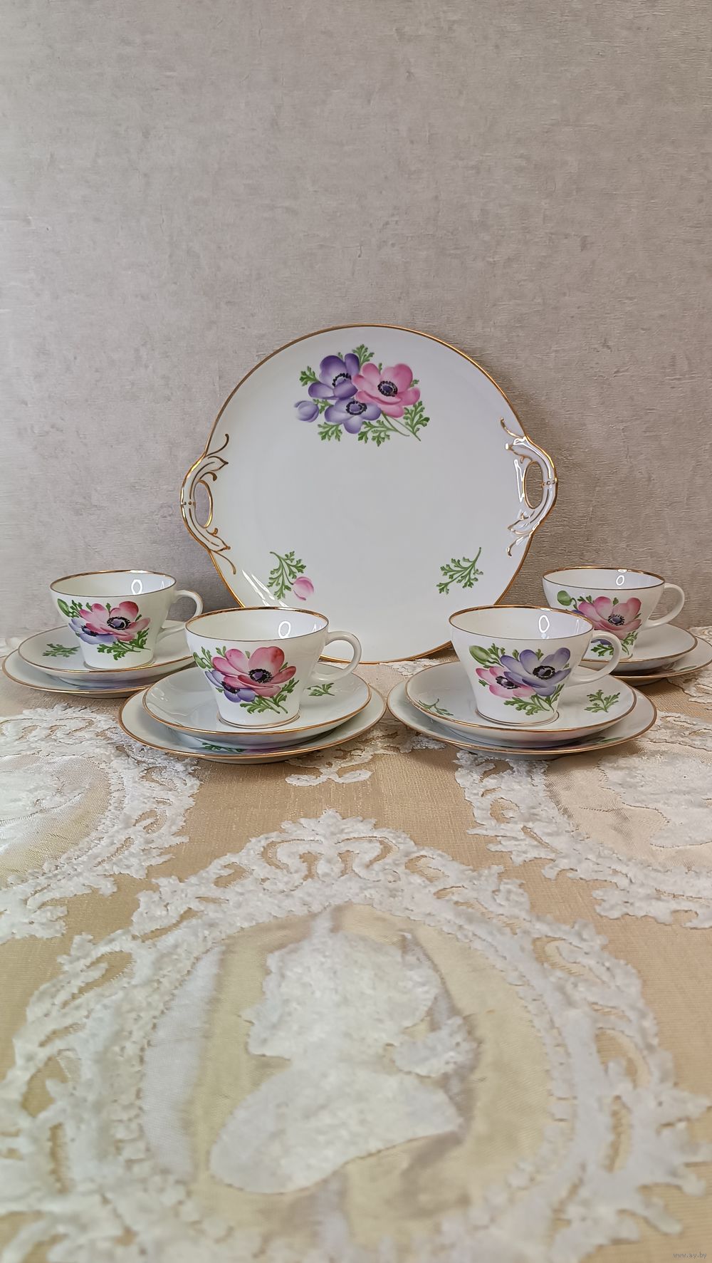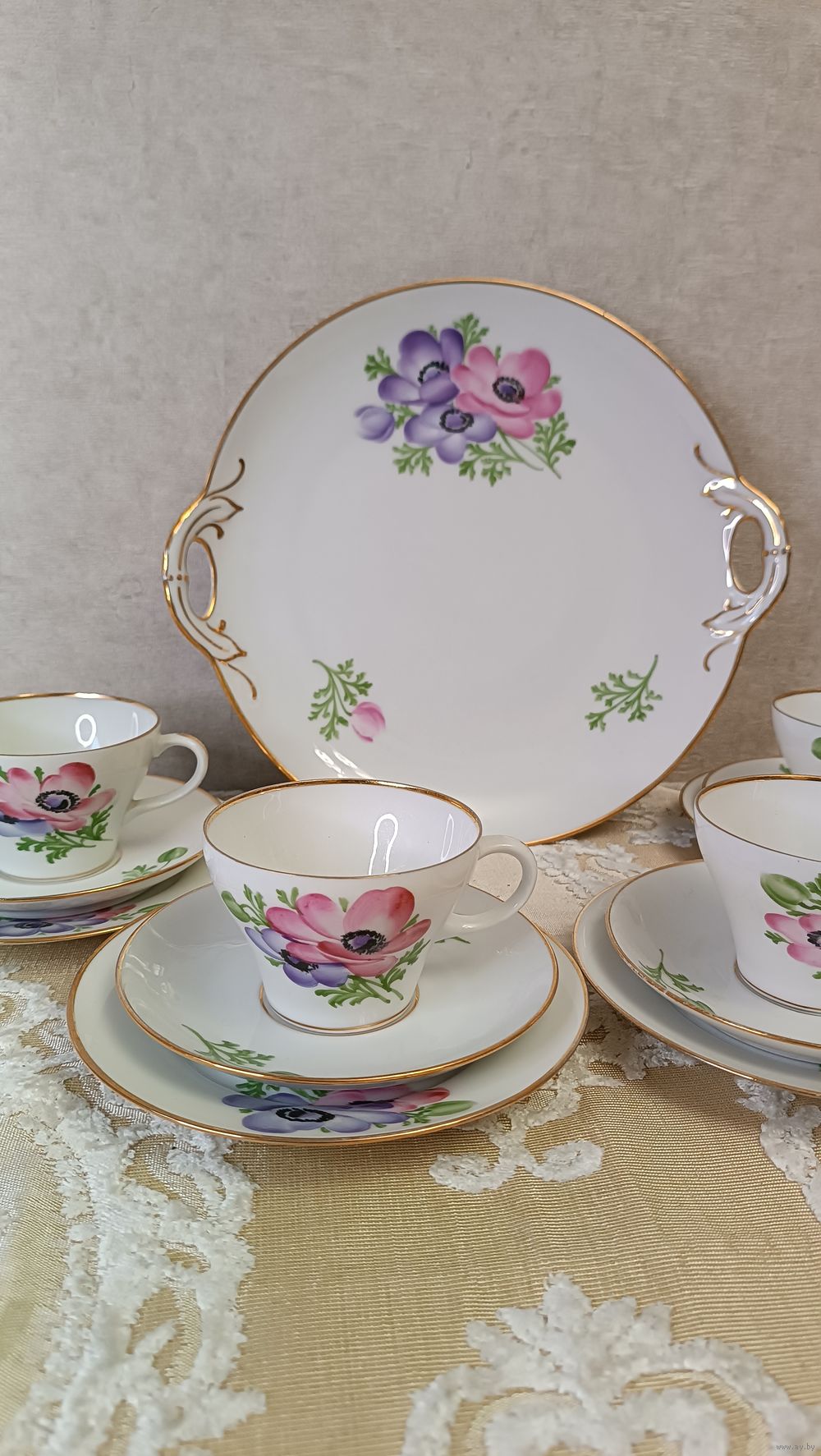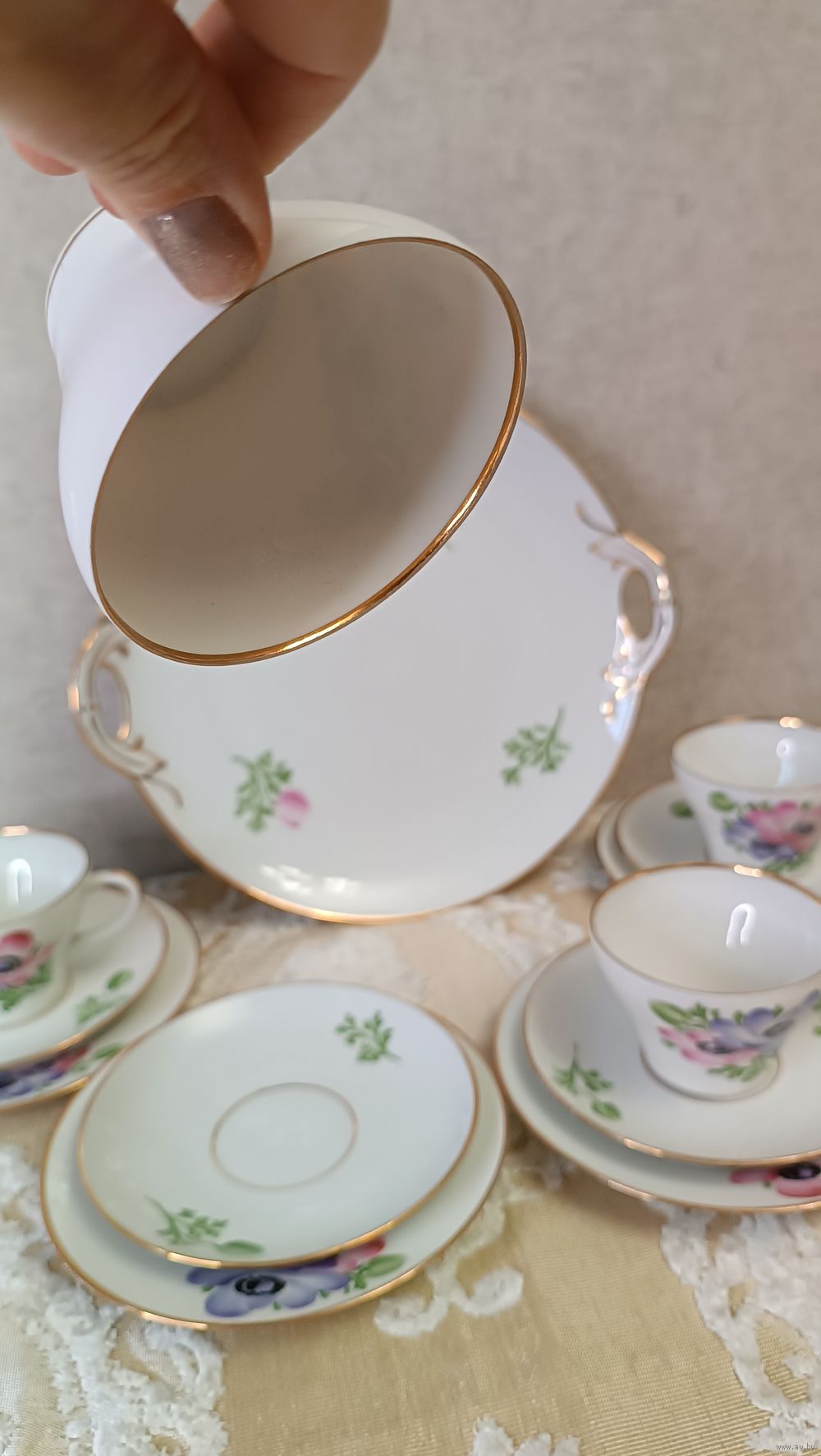 | Красивое блюдо с ушками и 4 тройки костяного фарфора с ручной росписью. | |