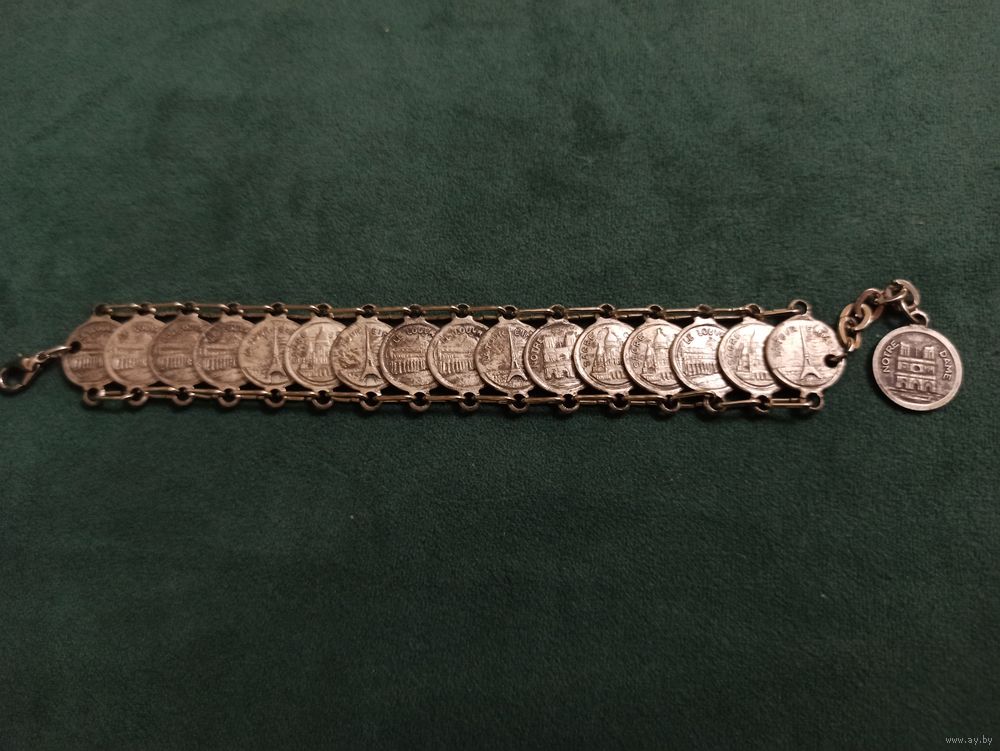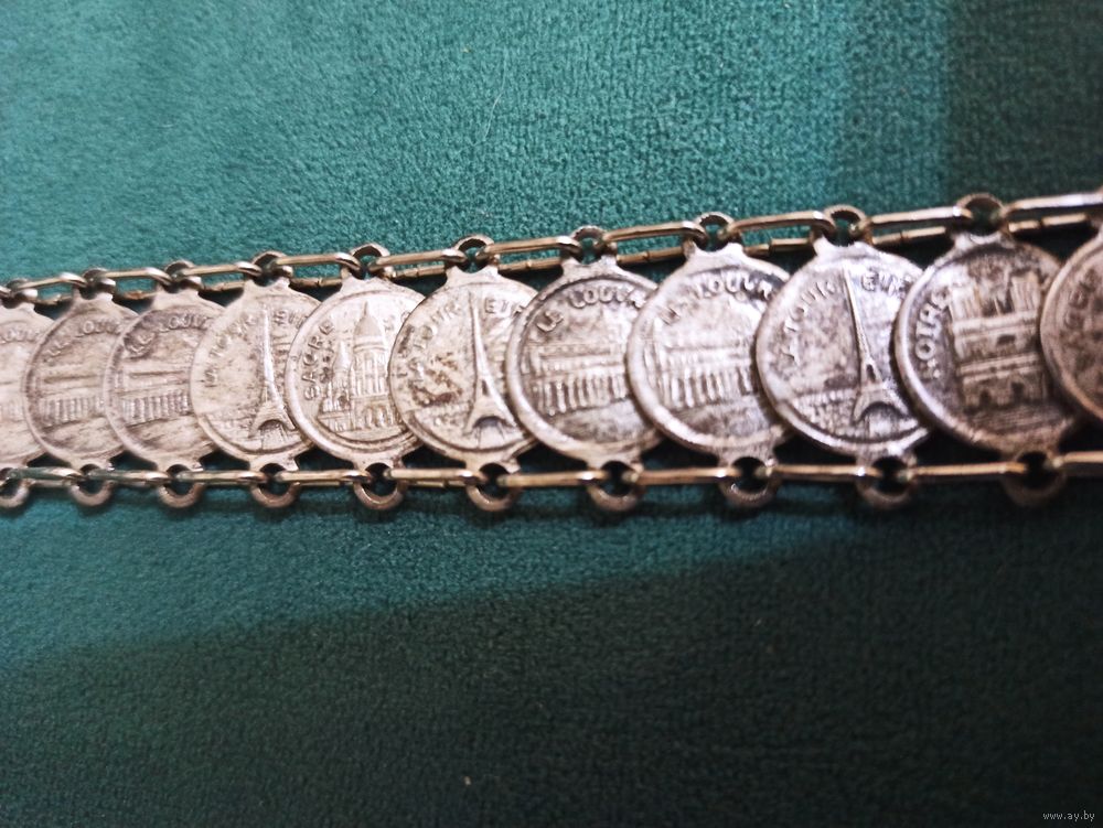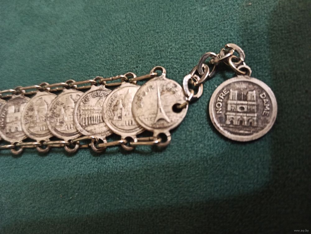 Винтажный сувенирный браслет из Франции с изображением Эйфелевой башни, коллекционный объект 1950-х годов. Браслет состоит из серии соединенных медальонов, каждый из которых украшен рельефным изображением достопримечательности Парижа. Материал билон( низкопробное серебро ).