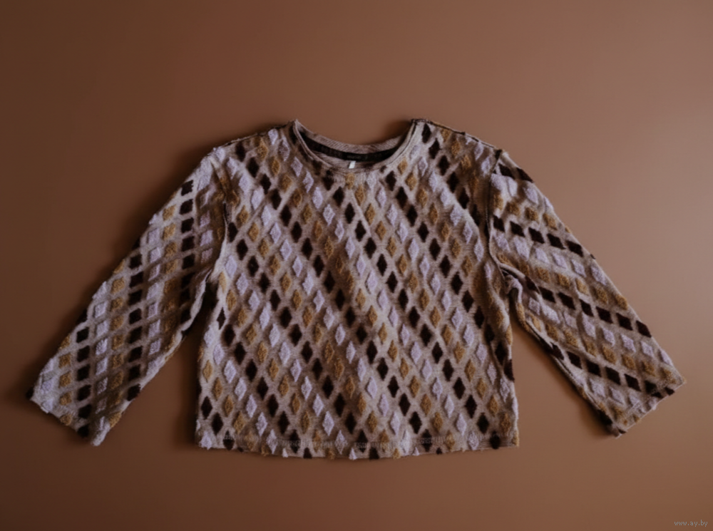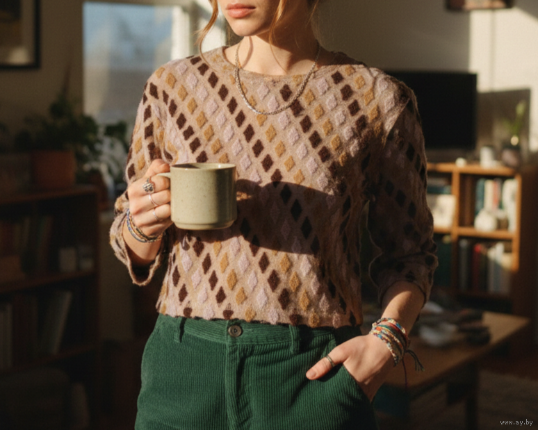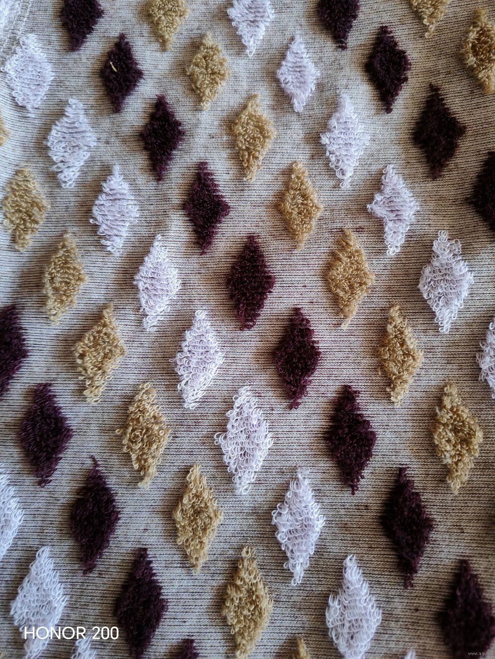 Модель выполнена со сложным многоцветным узором «ромбы» в теплой осенней палитре: шоколадный, янтарный и нежно-лиловый. Главная особенность - невероятно тактильная текстура, создающая 3D-эффект.