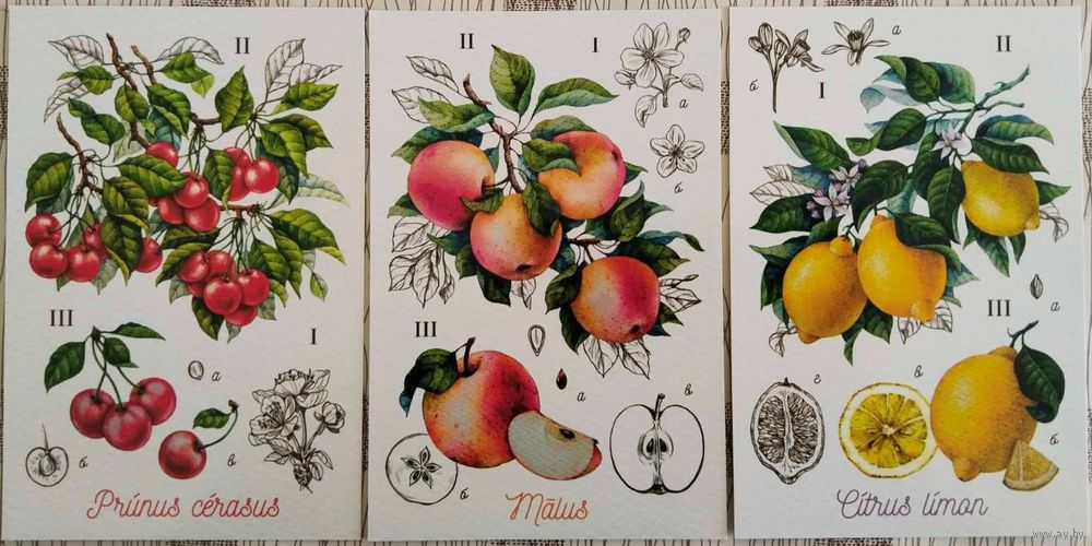Вишня. Лимон. Яблоня. Ботаническая иллюстрация. Худ.Е.Михеева. Россия. 2018 г.