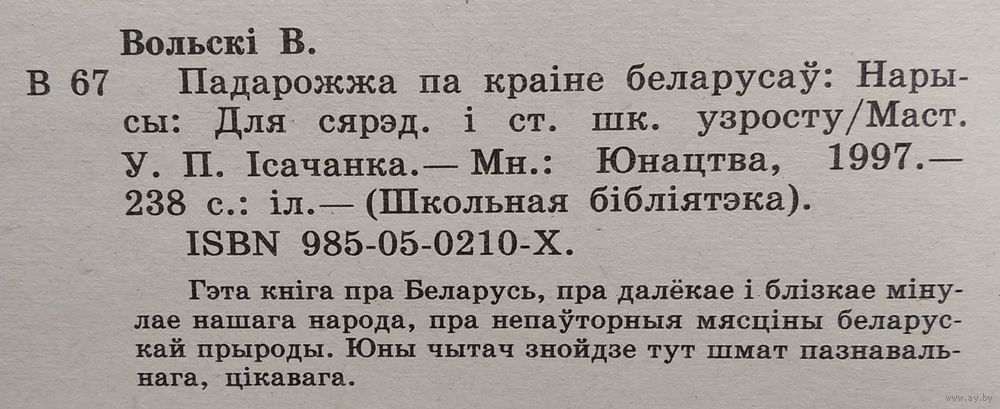 Віталь Вольскі. Падарожжа па краіне беларусаў: нарысы. (Школьная бібліятэка). Мн. Юнацтва, 1997 г. 238 с. Цверды пераплет.