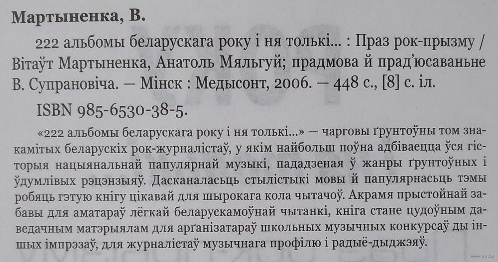 Вітаўт Мартыненка, Анатоль Мяльгуй. 222 альбомы беларускага року і ня толькі...: праз рок-прызму. Мінск : Медысонт, 2006 г. 431,с. Цверды пераплет.