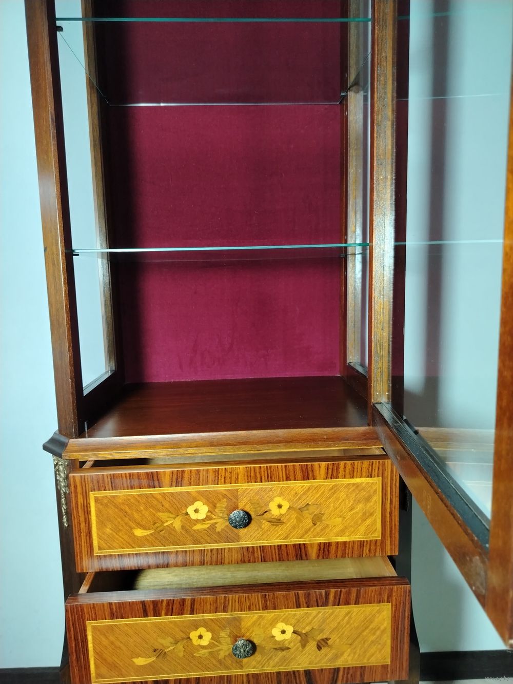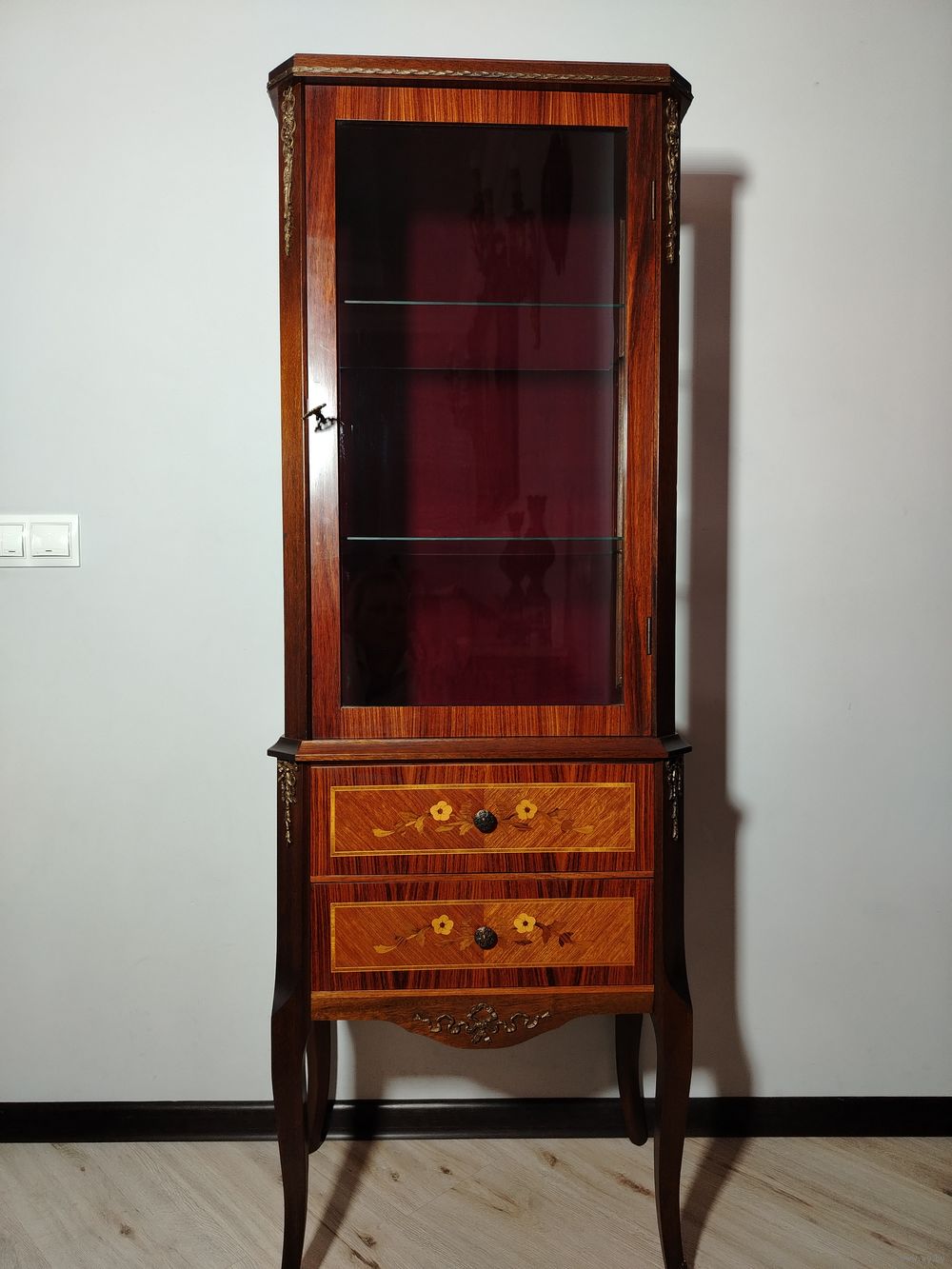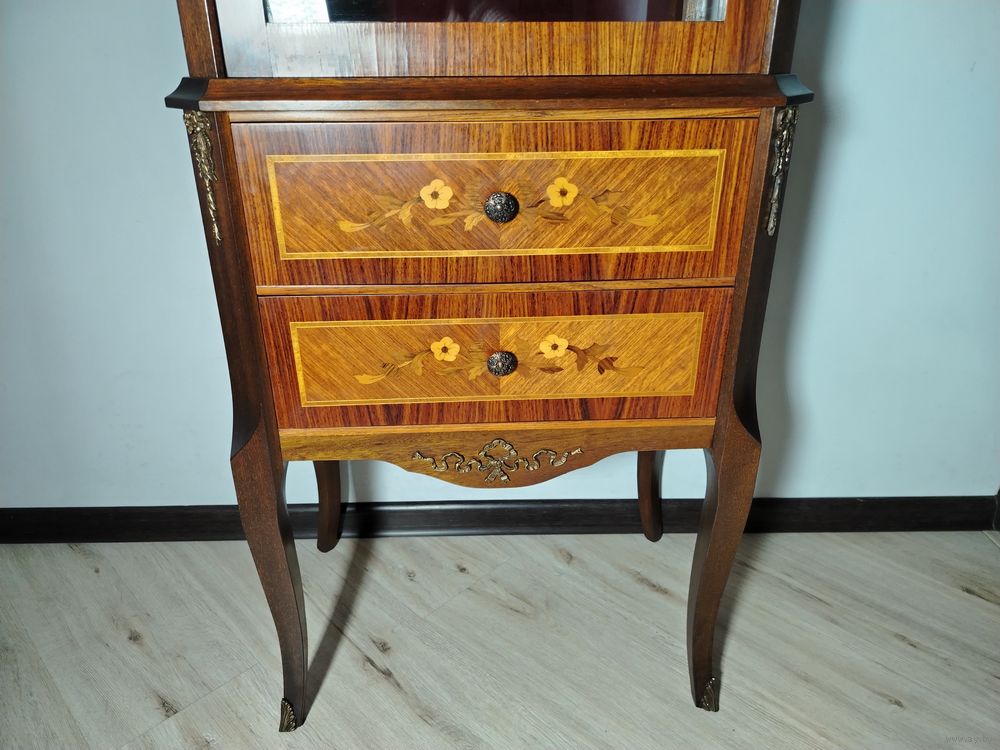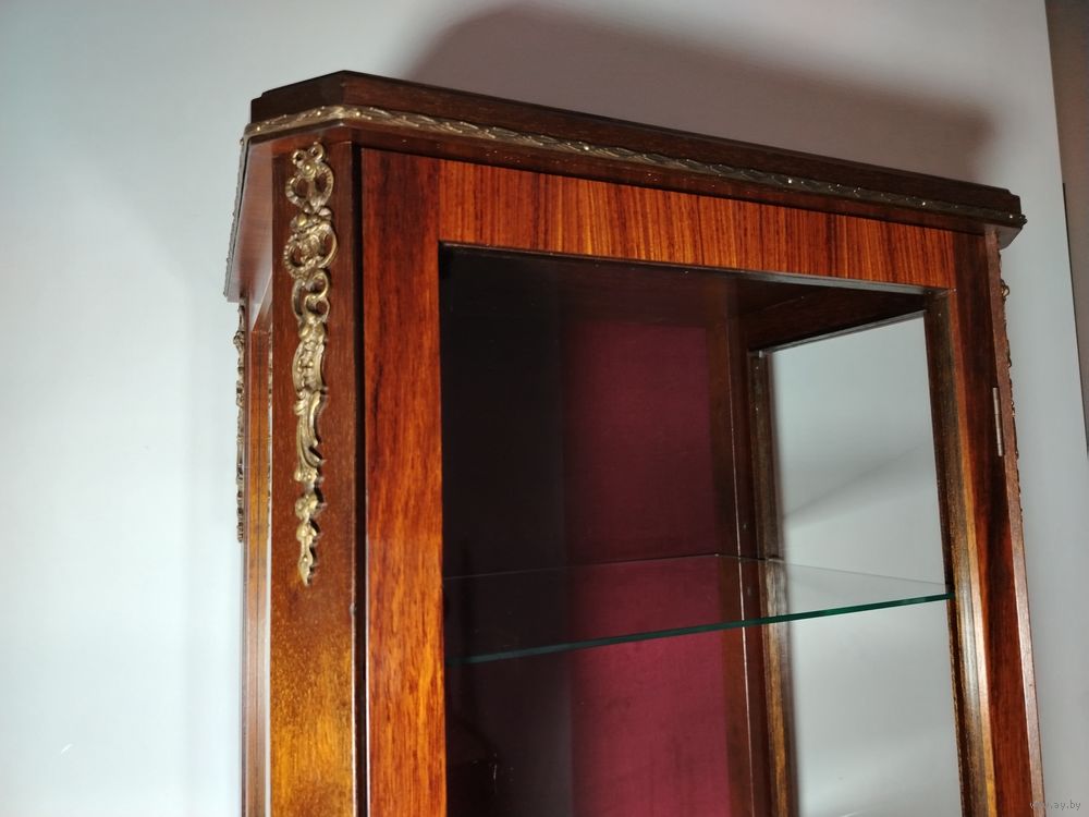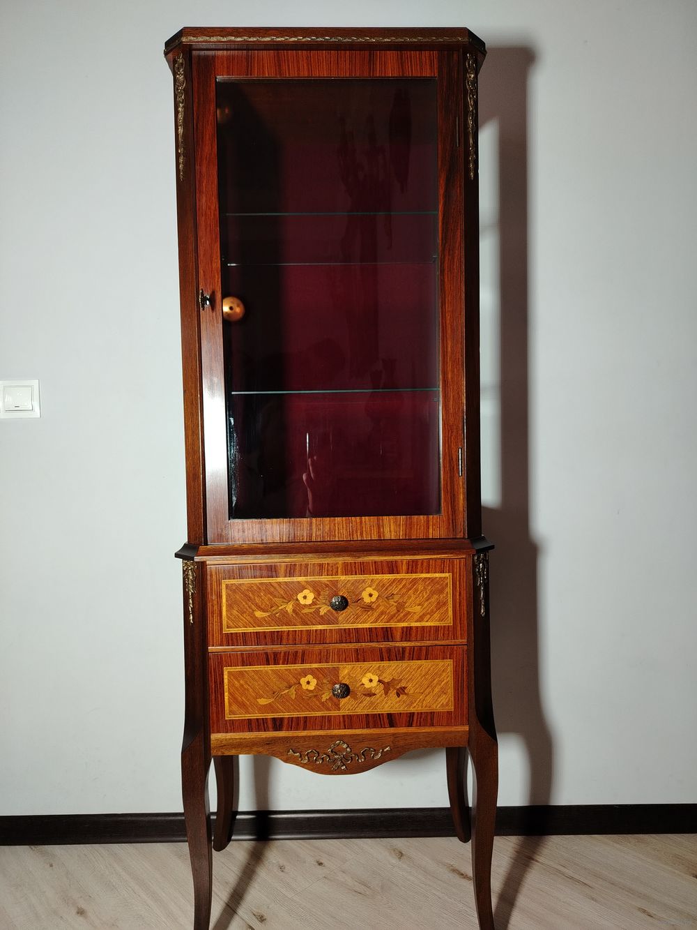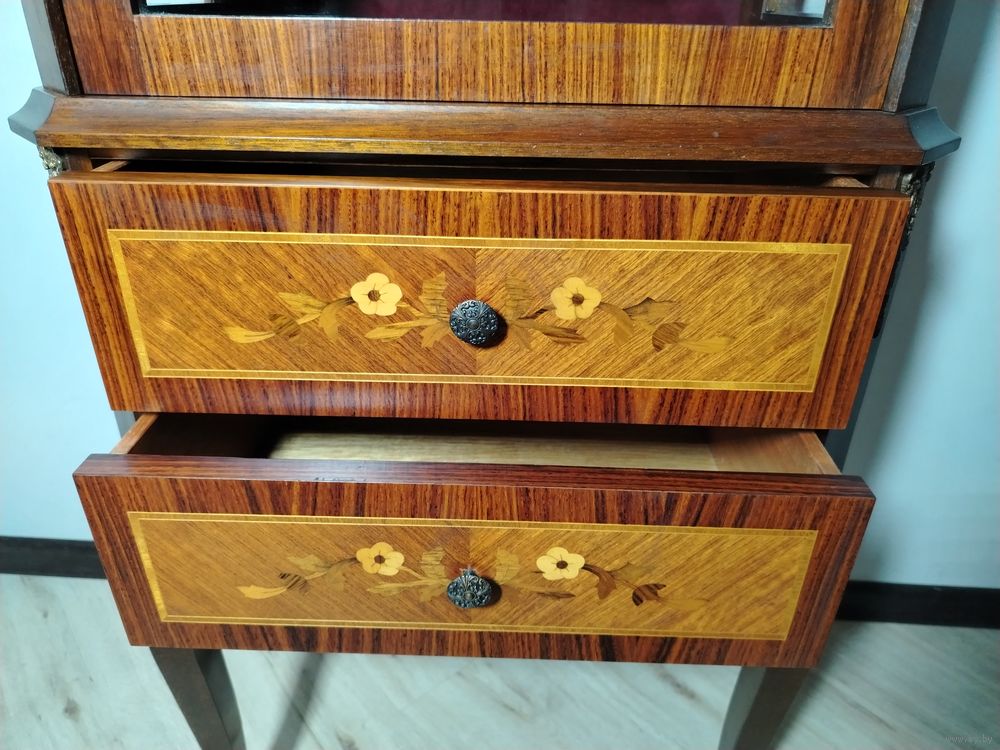 Витринка. Европа. Техника маркетри, бронзовые элементы. Высота 149 см ширина 86см глубина 48 см.