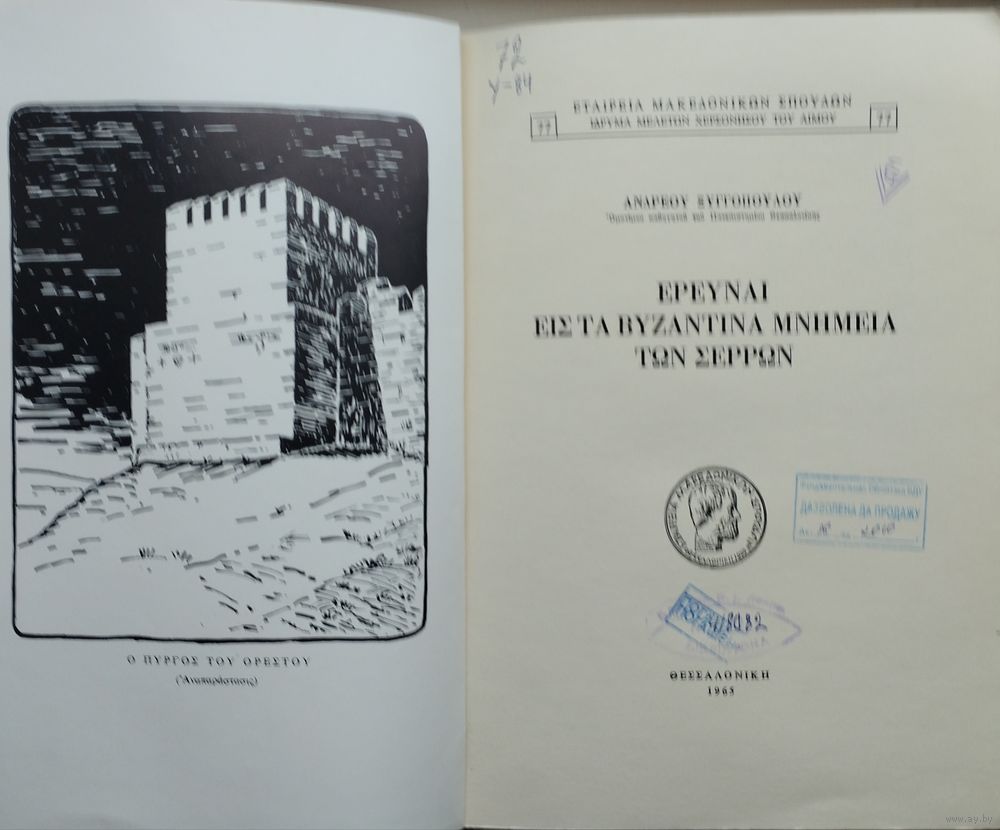 Отпечатано в Греции. Большой энциклопедический формат. 110 стр.Α. ΞΥΓΓΟΠΟΥΛΟΣ "ΕΡΕΥΝΑΙ ΕΙΣ ΤΑ ΒΥΖΑΝΤΙΝΑ ΜΝΗΜΕΙΑ ΤΩΝ ΣΕΡΡΩΝ" ΧΑΡΤΟΔΕΤΟ 1965 на греч. яз. История строительства крепостей Византии. Есть штампы.