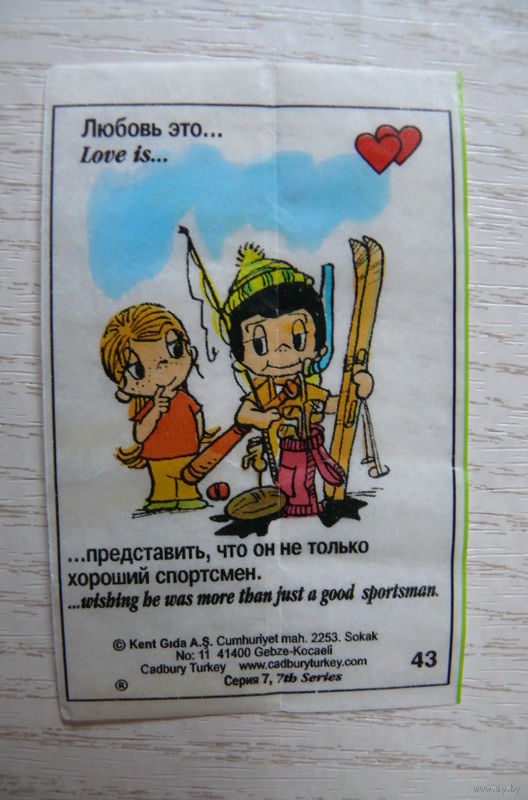 Вкладыш, жевательная резинка, Love is ... Любовь это ...; серия 7 (цена за 1 шт.) номер 43 (лыжи, удочка).