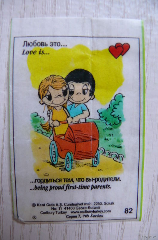 Вкладыш, жевательная резинка, Love is ... Любовь это ...; серия 7 (цена за 1 шт.) номер 82 (детская коляска).