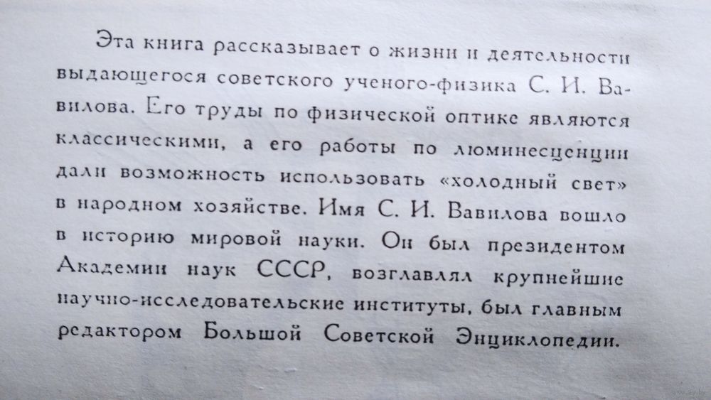 Эта книга рассказывает о жизни и деятельности выдающегося советского ученого — физика С.И.Вавилова. Его труды по физической оптике являются классическими, а его работы по люминесценции дали возможность использовать "холодный свет" в народном хозяйстве. Имя С.И.Вавилова вошло в историю мировой науки. Он был президентом Академии наук СССР, возглавлял крупнейшие научно-исследовательские институты, был главным редактором Большой Советской Энциклопедии.