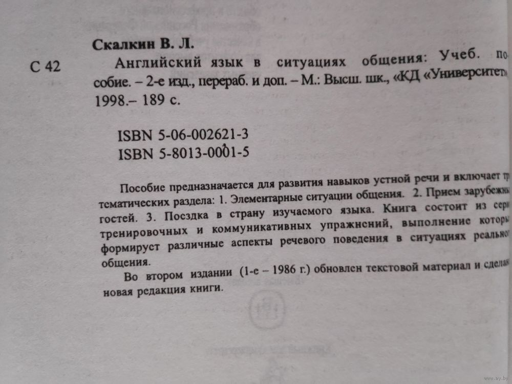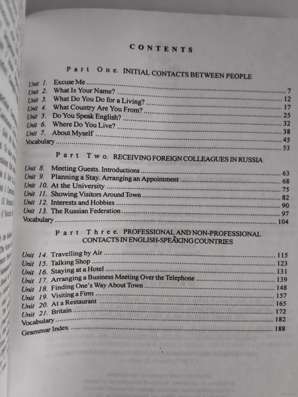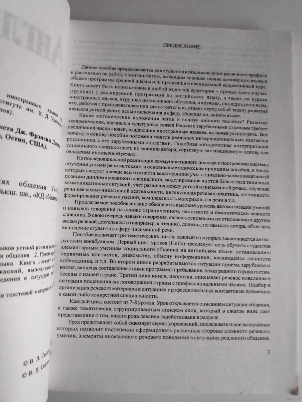 Пособие предназначается для развития навыков устной речи и включает тр тематических раздела: 1. Элементарные ситуации общения. 2. Прием зарубежные гостей. 3. Поездка в страну изучаемого языка. Книга состоит из сер тренировочных и коммуникативных упражнений, выполнение которые формирует различные аспекты речевого поведения в ситуациях реально общения.Во втором издании (1-е - 1986 г.) обновлен текстовой материал и сделана новая редакция книги.