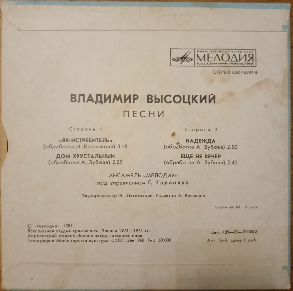 Владимир Высоцкий – Песни (ЯК-Истребитель) 7''