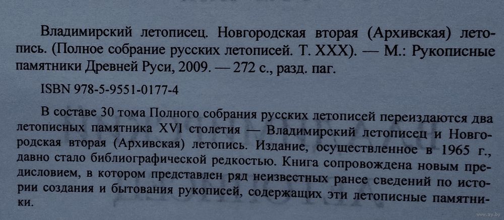 Полное собрание русских летописей. (ПСРЛ) Т. 30. Владимирский летописец. Новгородская вторая (Архивская) летопись. М.: Рукописные памятники древней Руси. 2009г. 272 стр. Твердый переплет, энциклопедический формат.