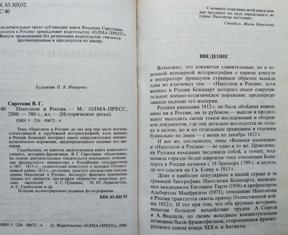 Тема `Наполеон и Россия` до сих пор еще мало изучена отечественной и зарубежной историографией, хотя именно в России Бонапарт потерпел самое сокрушительное военно - политическое поражение, предопределившее падение его империи. Самобытная, во многом дискуссионная книга известного ученого, историка - франковеда В. Г. Сироткина объективно, на основе документальных свидетельств показывает отношение французского императора с Российским государством в 1801 - 1815гг., увлекательно повествует о загадках Отечественной войны 1812г, по - своему трактует последствия похода армии Наполеона в Россию, исследует феномен изменения оценки его личности, анализируя творчество известных русских писателей - А. С. Пушкина, М. Ю. Лермонтова, А. С. Грибоедова и др. Издание иллюстрировано редкими фотографиями.