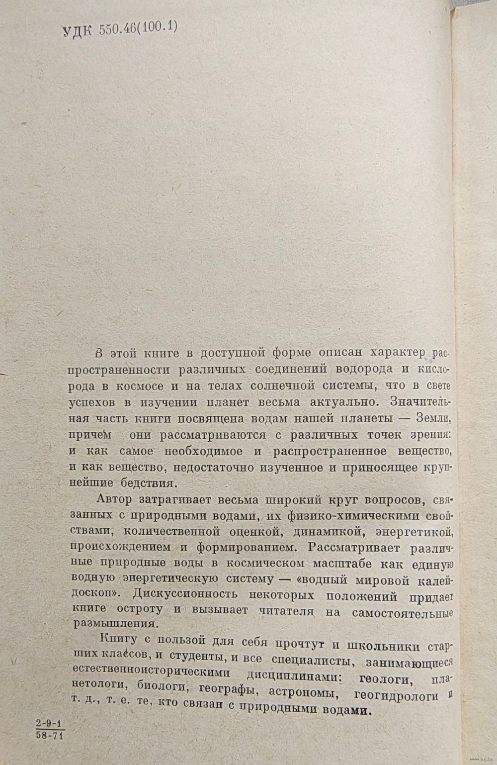 Книгу с пользой для себя прочтут и школьники старших классов, и студенты, и все специалисты, занимающиеся естественноисторическими дисциплинами: геологи, планетологи, биологи, географы, астрономы, геогидрологи и т. д., т. е. те, кто связан с природными водами.