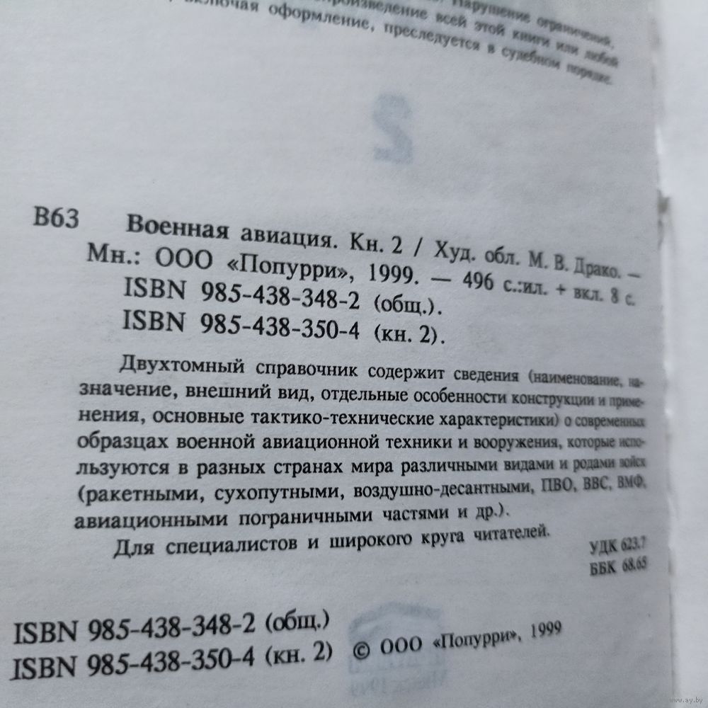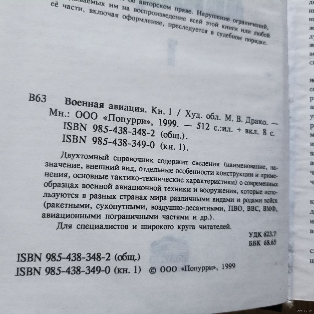 Гордеенко Ю.В., Морозов В.П., Прибылов А.С. том 1: Самолеты, вертолеты. Том 2: Самолеты, вертолеты, ракетное вооружение. Справочник в 2-х книгах. Минск. Попурри. 1999 г. 512+496 с+вклейки Твердый переплет, Обычный формат.