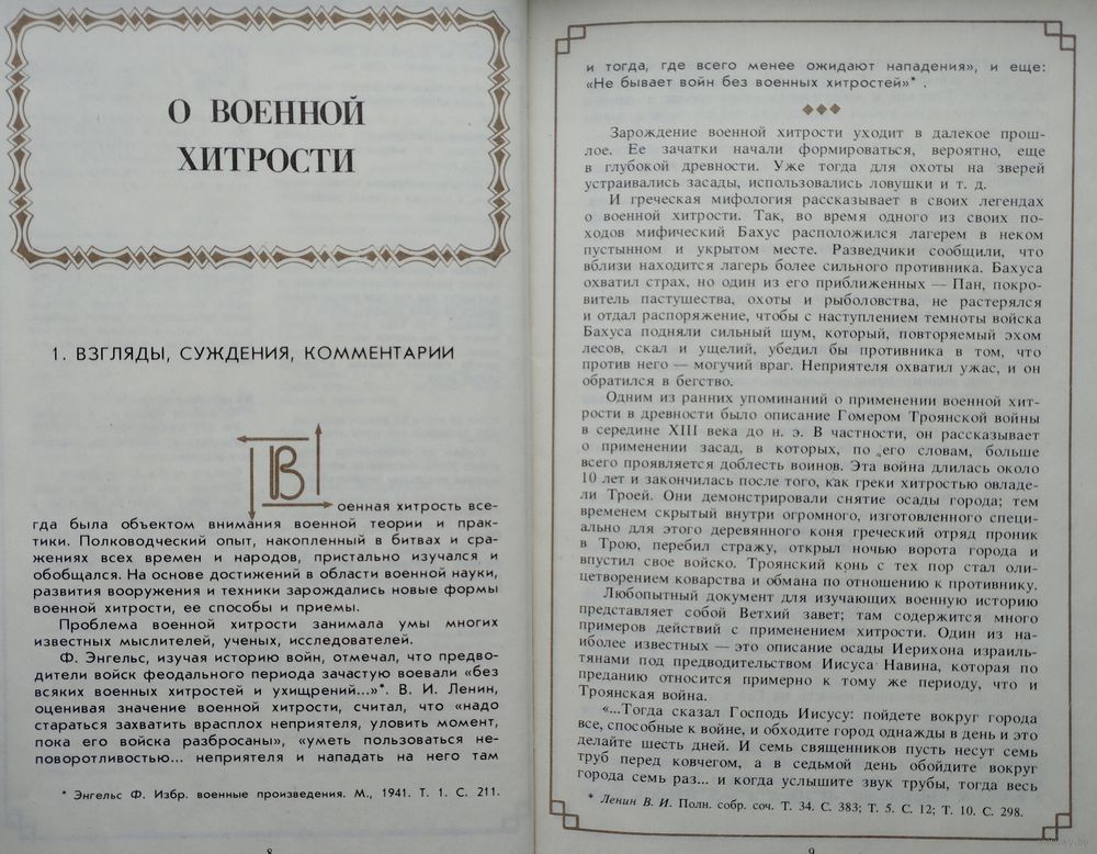 Большой формат. Тираж 50000 экз. 258 стр. Книга посвящена малоизученной проблеме военного искусства — военной хитрости. Рассматривается ее использование в войнах, битвах и сражениях с древности до наших дней. На конкретных исторических примерах раскрываются секреты достижения победы с наименьшими затратами сил, времени и средств. Показывается универсальное значение характерных для военной хитрости принципов, методов и приемов для решения особо сложных и ответственных управленческих проблем в ситуациях повышенного риска. Приводятся извлечения из трудов теоретиков военной науки и видных военачальников. Для слушателей военно-учебных заведений, командного состава воинских частей, ученых и специалистов, исследующих проблемы управления, для руководителей, принимающих ответственные решения в государственно-политической, финансовой и деловой сферах. Представляет интерес для широких кругов читателей.