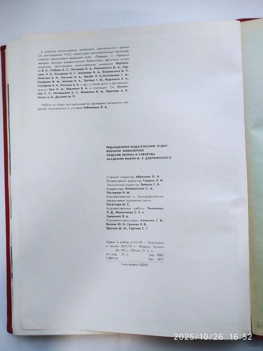 Юбилейный альбом, посвященный 150-летию Академии. Составитель-автор И. И. Кужельков. Оформление худ. М. С. Погостера. М.: Ред.-изд. отдел Военной инженерной ордена Ленина и Суворова Академии имени Ф.Э. Дзержинского, 1969 г. 248с. Твердый переплет, Энциклопедический формат.