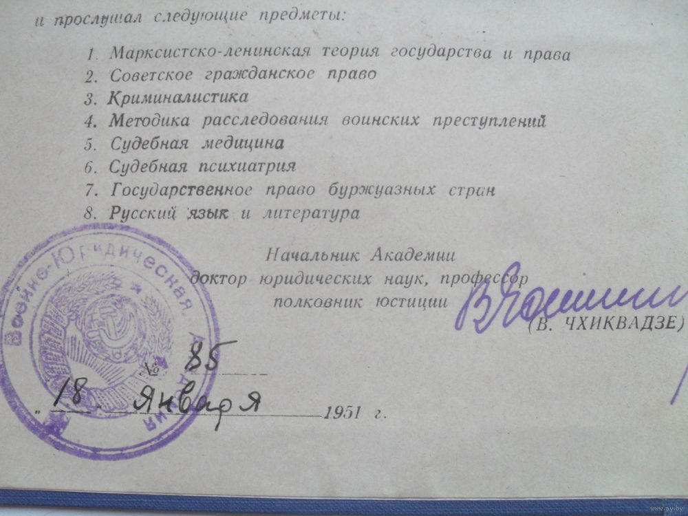 Военно-Юридическая Академия Советской Армии.Свидетельство об окончании Курсов усовершенствования.1951 г.