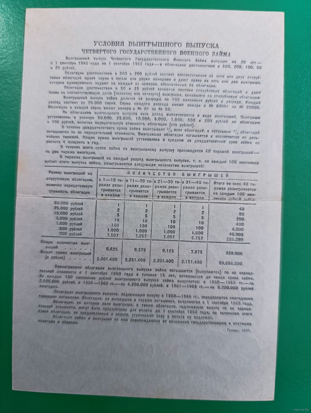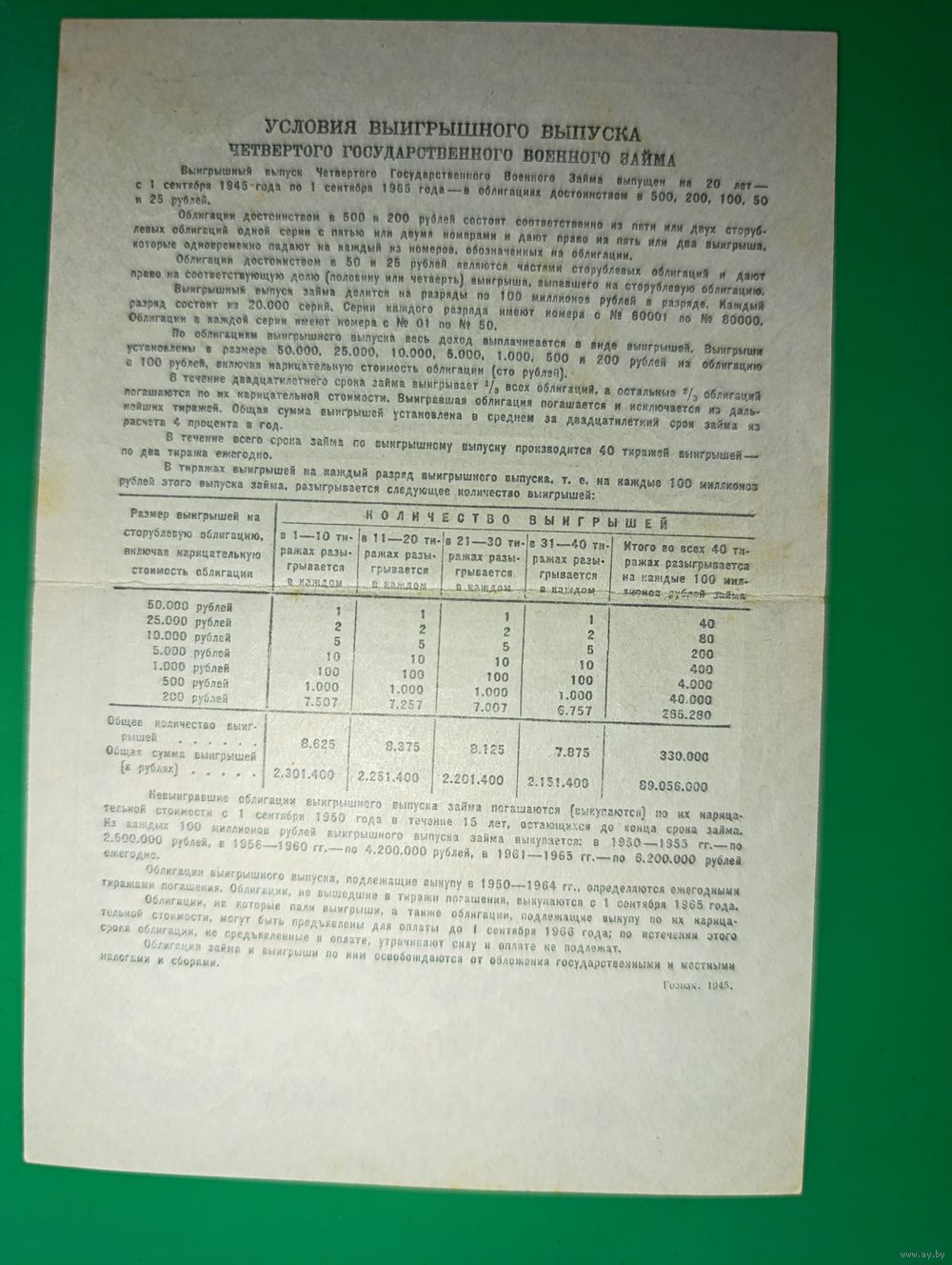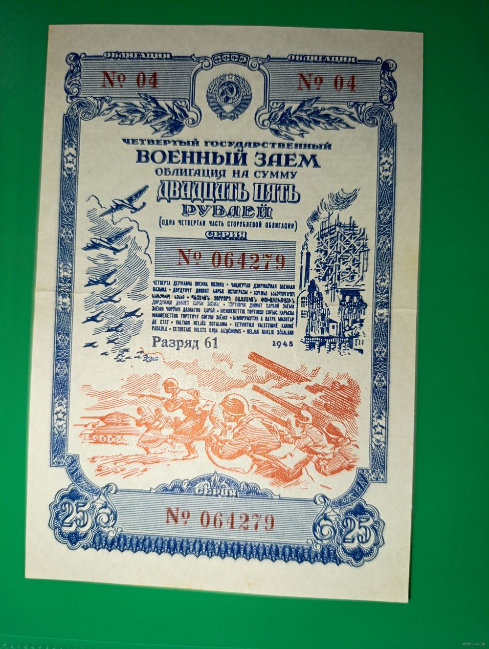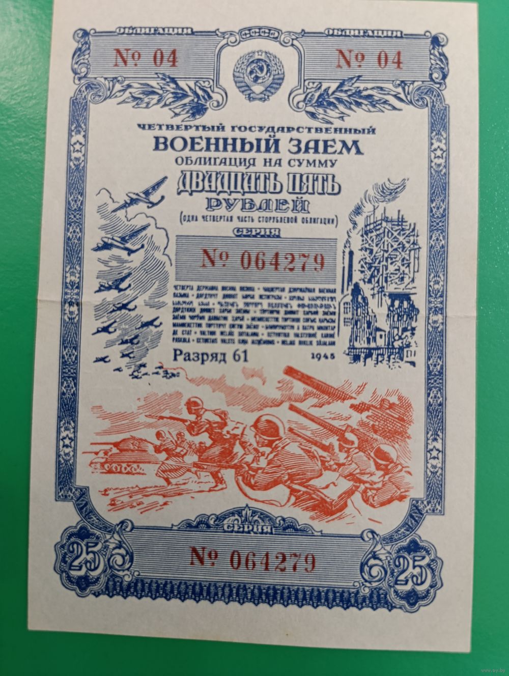 Продам облигацию на сумму 25 рублей, четвертого государственного военного займа. Год выпуска 1945. Дополнительные фотографии по запросу.