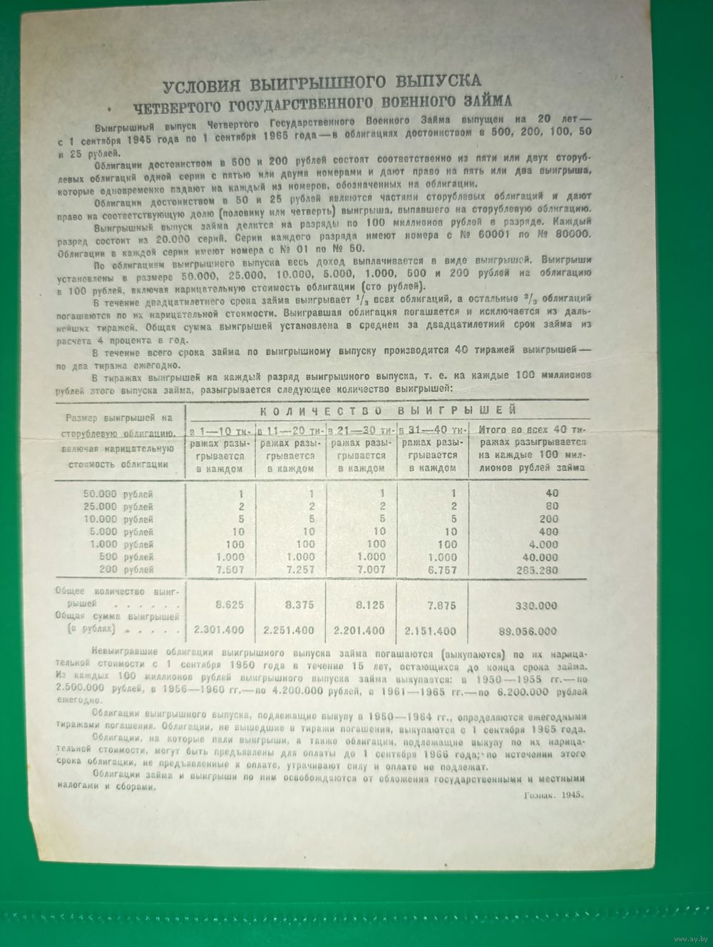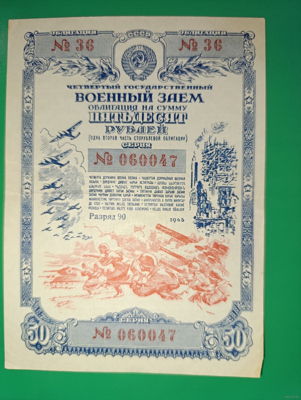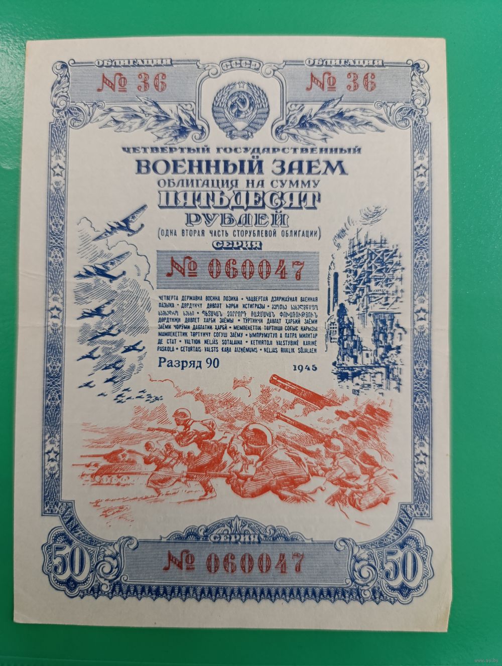 Продам облигацию на сумму 50 рублей, четвертого государственного военного займа. Год выпуска 1945. Дополнительные фотографии по запросу.
