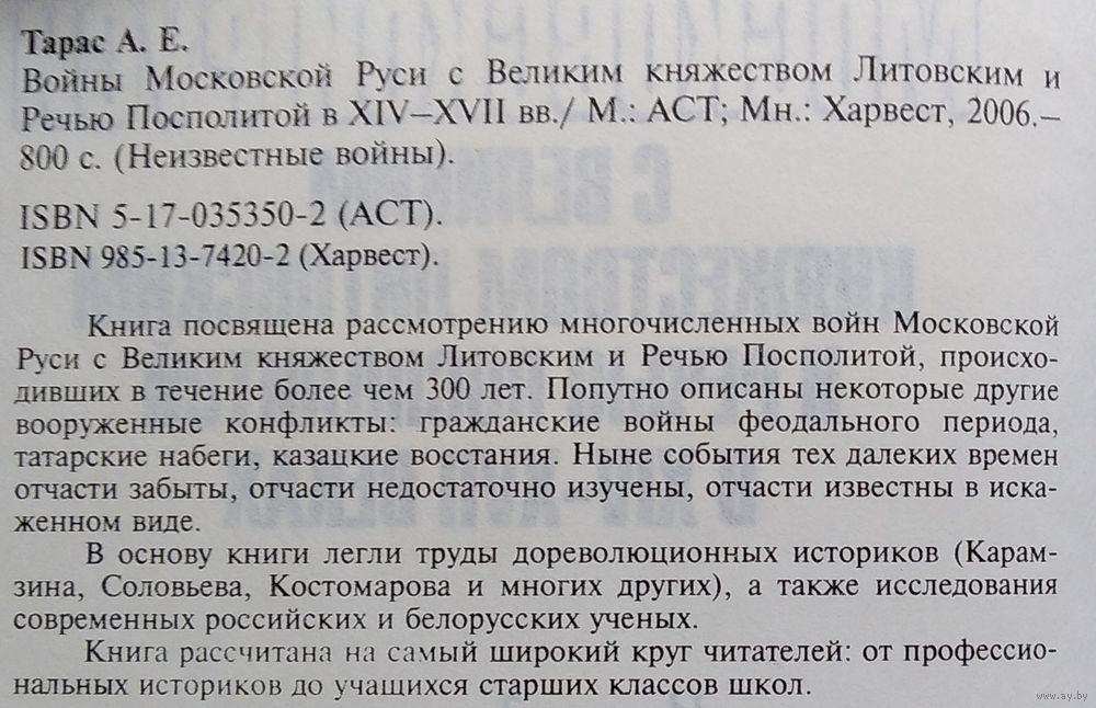 Войны Московской Руси с Великим княжеством Литовским и Речью Посполитой в XIV - XVII веках. (Неизвестные войны). А.Е.Тарас. - Изд. 2-е, исправленное. - Москва : АСТ : Минск, Харвест, 2006 г. - 799 с. Твердый переплет.