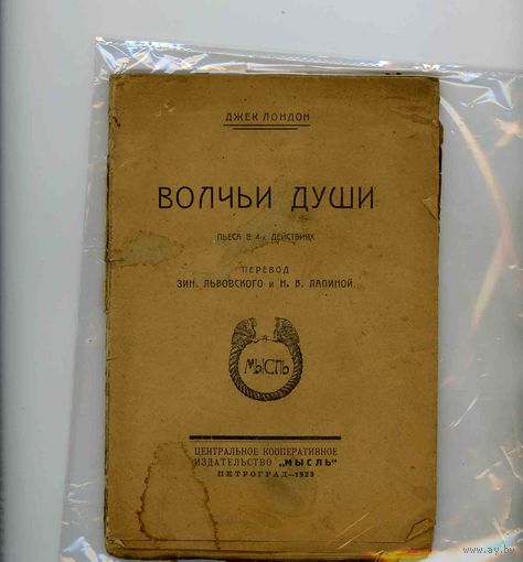 Петроград, 1922 год. Центральное кооперативное издательство "Мысль". Типографский переплет. Сохранность хорошая. Оригинальное название представленной в издании пьесы Джека Лондона - "Theft" (Кража). «Кража» - лучшая драма Лондона. Эта история объединила и любовные отношения и спекуляцию политическими интересами, откровенное предательство и мужественные поступки. Джек Лондон, создав «Кражу», считал, что на сей раз он написал «довольно хорошую пьесу». Однако нью-йоркские театральные агентства, которым драматург предложил свое произведение, единодушно от него отказались, и Лондону так и не удалось увидеть «Кражу» в сценическом исполнении. Интересно, что, «Кража» не получившая признания на родине писателя, почти сразу же после своего появления была переведена на русский язык. Первый русский перевод драмы Лондона, правда, очень вольный и неточный, появился в 1911 году. В 1925 году «Кража» под названием «Волчьи души» шла на сцене Малого театра.