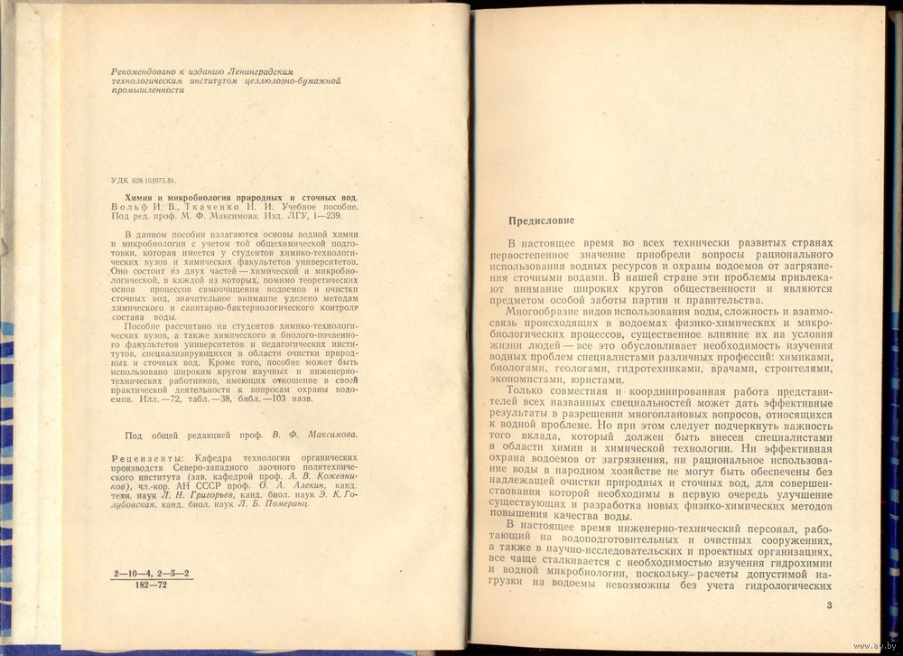 Пособие рассчитано на студентов химико-технологических вузов, а также химического и биолого-почвенного факультетов университетов и педагогических институтов, специализирующихся в области очистки природных и сточных вод. Кроме того, пособие может быть использовано широким кругом научных и инженерно-технических работников, имеющих отношение в своей практической деятельности к вопросам охраны водоемов.