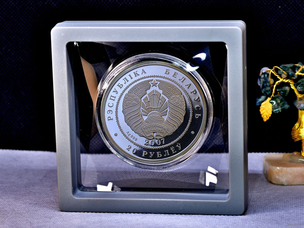 в центре в круге, обрамленном геометрическим орнаментом, – рельефное изображение Государственного герба Республики Беларусь, под ним указан год чеканки, проба сплава; по кругу надписи: вверху – РЭСПУБЛIКА БЕЛАРУСЬ, внизу – ПЯЦЬДЗЕСЯТ РУБЛЁЎ (на золотой) и 20 РУБЛЁЎ (на серебряной).