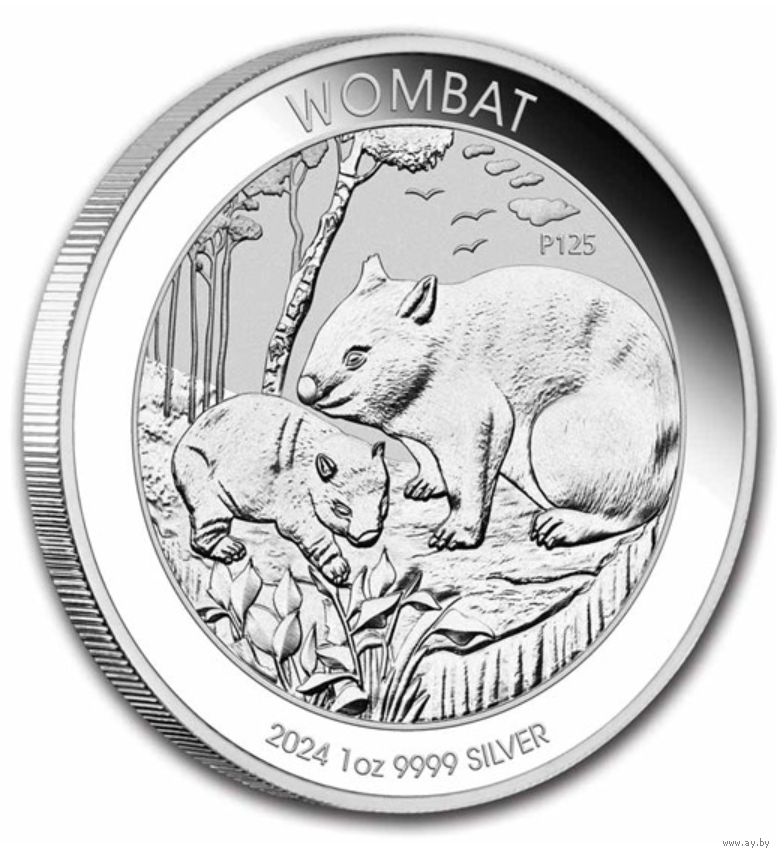 Реверс: изображение матери-вомбата и ее детеныша. Дизайн включает надпись «WOMBAT», вес и пробу, год выпуска и знак монетного двора «P125» монетного двора Перта в честь 125-летия монетного двора Перта.