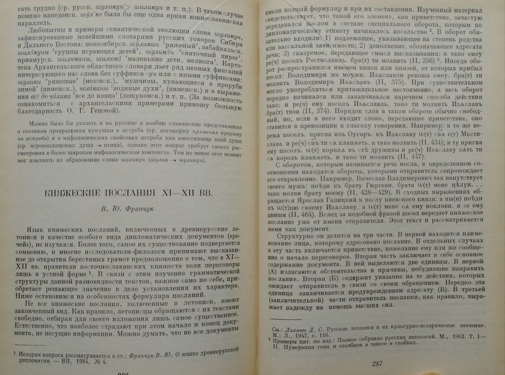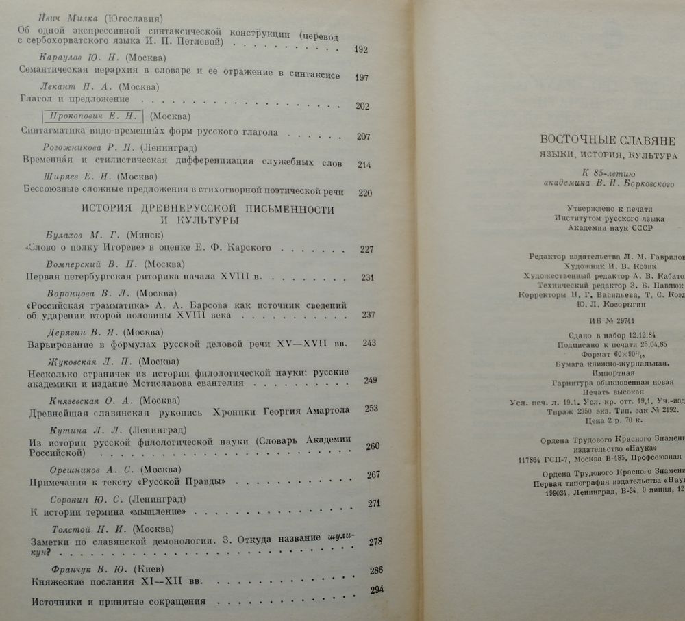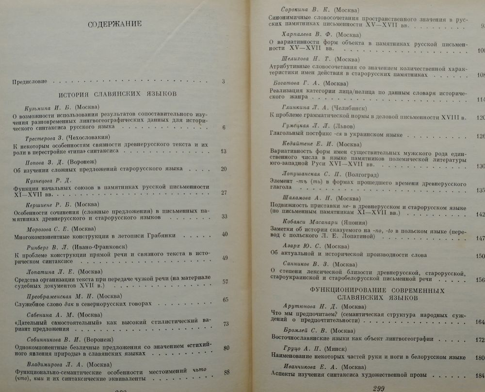 Большой формат. Тираж 2050 экз. 308 стр. Сборник, посвященный памяти академика В.И. Борковского, включает статьи, отражающие широкий круг его исследовательских интересов. Преимущественное внимание уделено проблемам истории русского языка и русской культуры (исторический синтаксис, вопросы функционирования современных славянских языков и их диалектов; вопросы истории и культуры восточных славян). СОДЕРЖАНИЕ Предисловие ИСТОРИЯ СЛАВЯНСКИХ ЯЗЫКОВ Кузьмина И.Б. (Москва) О возможности использования результатов сопоставительного изучения разновременных лингвогеографических данных для исторического синтаксиса русского языка Трестерова 3. (Чехословакия) К некоторым особенностям связности древнерусского текста и их роли в перестройке «типа» синтаксиса Попова 3.Д. (Воронеж) Об изучении сложных предложений старорусского языка Кузнецова Р.Д. Функции начальных союзов в памятниках русской письменности XI-XVII вв. Кершиене Р.Б. (Москва) Особенности сочинения (сложные предложения) в письменных памятниках древнерусского и старорусского языков Морозова С.Е. (Москва) Многокомпонентные конструкции в летописи Грабянки Ринберг В.Л. (Ивано-Франковск) К проблеме конструкции прямой речи и связного текста в историческом синтаксисе Лопатина Л.Е. (Москва) Средства организации текста при передаче чужой речи (на материале судебных документов XVII в.) Преображенская М.Н. (Москва) Служебное слово дак в севернорусских говорах Сабенина Л.М. (Москва) «Дательный самостоятельный» как высокий стилистический вариант предложения Собинникова В.И. (Воронеж) Однокомпонентные безличные предложения со значением «стихийного явления природы» в славянских языках Владимирова Л.Л. (Москва) Функционально-семантические особенности местоимений чьто (что), кыи и их синтаксические эквиваленты Сорокина В.К. (Москва) Синонимичные словосочетания пространственного значения в русских памятниках письменности XV—XVII вв. Харпалева В.Ф. (Москва) О вариативности форм объекта в памятниках русской письменности XV—XVII вв. Шелихова Н.Т. (Москва) Атрибутивные словосочетания со значением количественной характеристики имен действия в старорусских памятниках Богатова Г.А. (Москва) Реализация категории лица/нелица по данным словаря исторического жанра Глинкина Л.А. (Челябинск) К проблеме грамматической нормы в деловой письменности XVIII в. Гумецкая Л.Л. (Львов) Глагольный постфикс -ся в украинском языке Кедайтене Е.И. (Москва) Вариативность форм имен существительных мужского рода единственного числа в языке памятников полемической литературы юго-западной Руси XVI—XVII вв. Лопушанская С.П. (Волгоград) Элемент ~тъ (ть) в формах прошедшего времени древнерусского глагола Шаламова А.Н. (Москва) Подвижность приставки не- в древнерусском и старорусском языке (по письменным памятникам XI—XVII вв.) Кобаяси Масанари (Япония) Заметки об истории сказуемого на -no, -to в польском языке (перевод с польского Л.Е. Лопатиной) Азарх Ю.С. (Москва) Об актуальной и исторической производности слова Санников В.3. (Москва) О степени лексической близости древнерусской, старорусской, староукраинской и старобелорусской письменной речи ФУНКЦИОНИРОВАНИЕ СОВРЕМЕННЫХ СЛАВЯНСКИХ ЯЗЫКОВ Арутюнова Н.Д. (Москва) Что мы предпочитаем? (семантическая структура народных суждений о предпочтительности) Бромлей С.В. (Москва) Восточнославянские 