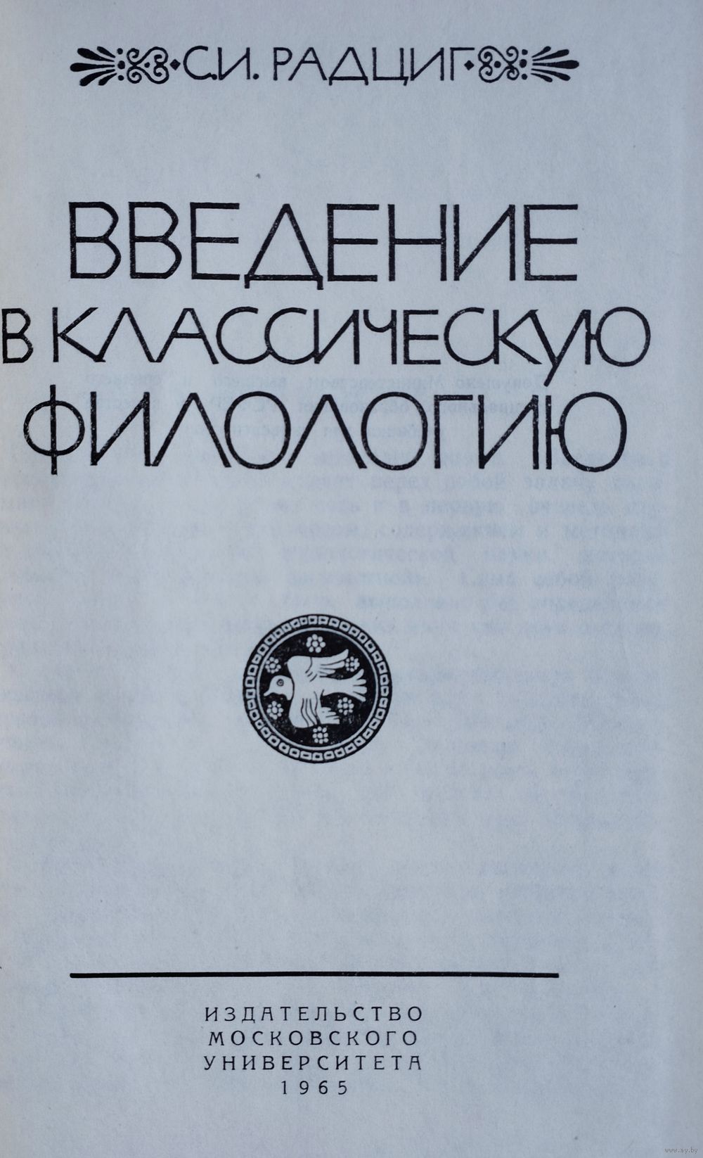 Большой формат. Тираж 5000 экз. 528 стр. Предлагаемая вниманию читателей книга «Введение в классическую филологию» ставит перед собой задачу ознакомить советскую общественность и в первую очередь студенческую молодежь с предметом, содержанием и методами той области современной филологической науки, которая называется «классической филологией». Само собой разумеется, что это не может быть выполнено без определения общей сущности всех филологических наук как наук о слове, выразителе мыслей человека.