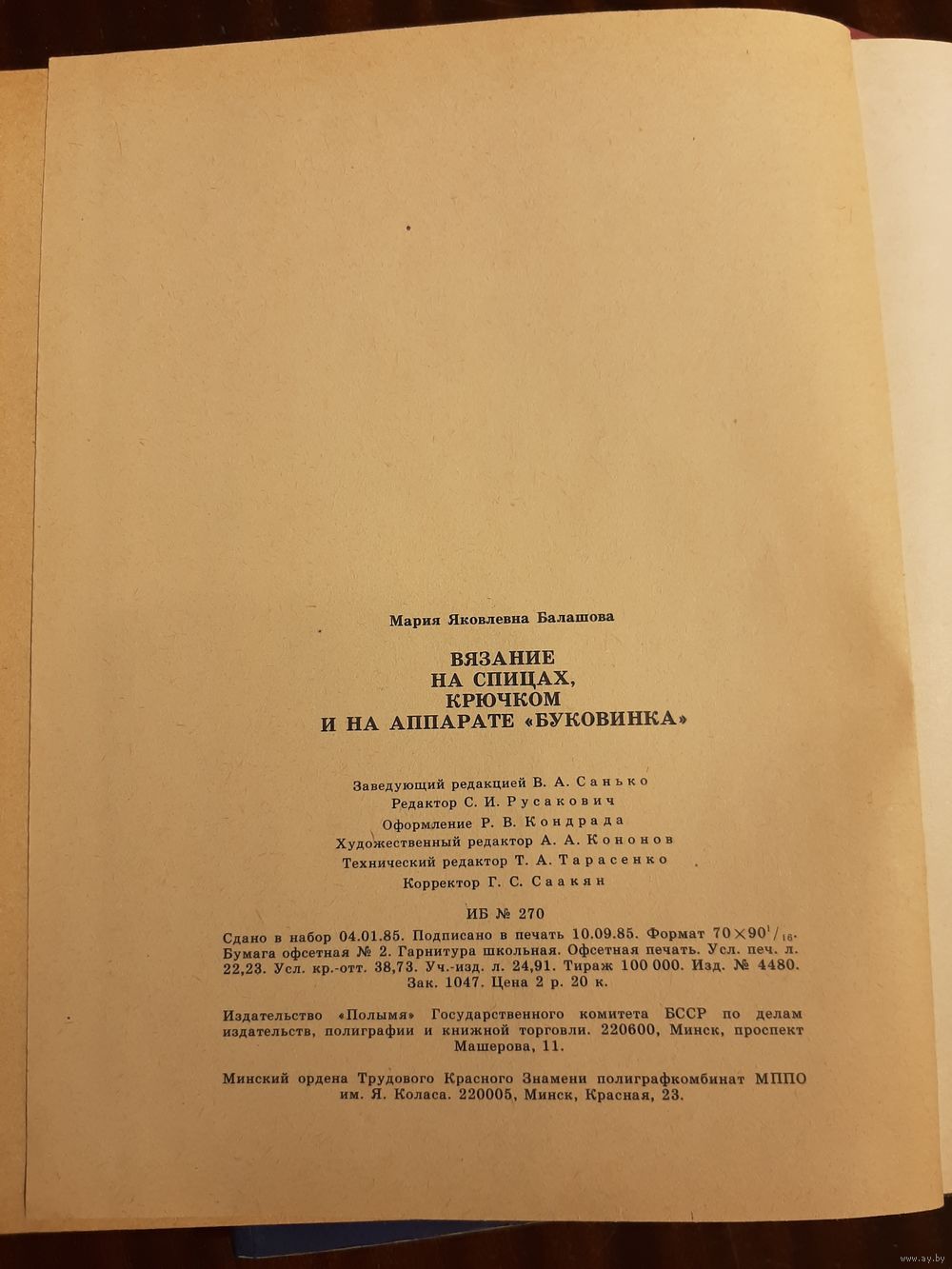 Книга "Вязание на спицах, крючком и на аппарате "Буковинка"". Подробно изложены принципы вязки на спицах, крючком и на аппарате "Буковинка". Разъясняется как делать выкройки и производить расчёты петель и петельных рядов при вязании изделий. Предлагается большой выбор изделий женской, мужской, детской одежды. Приведено описание образцов узоров вязки.