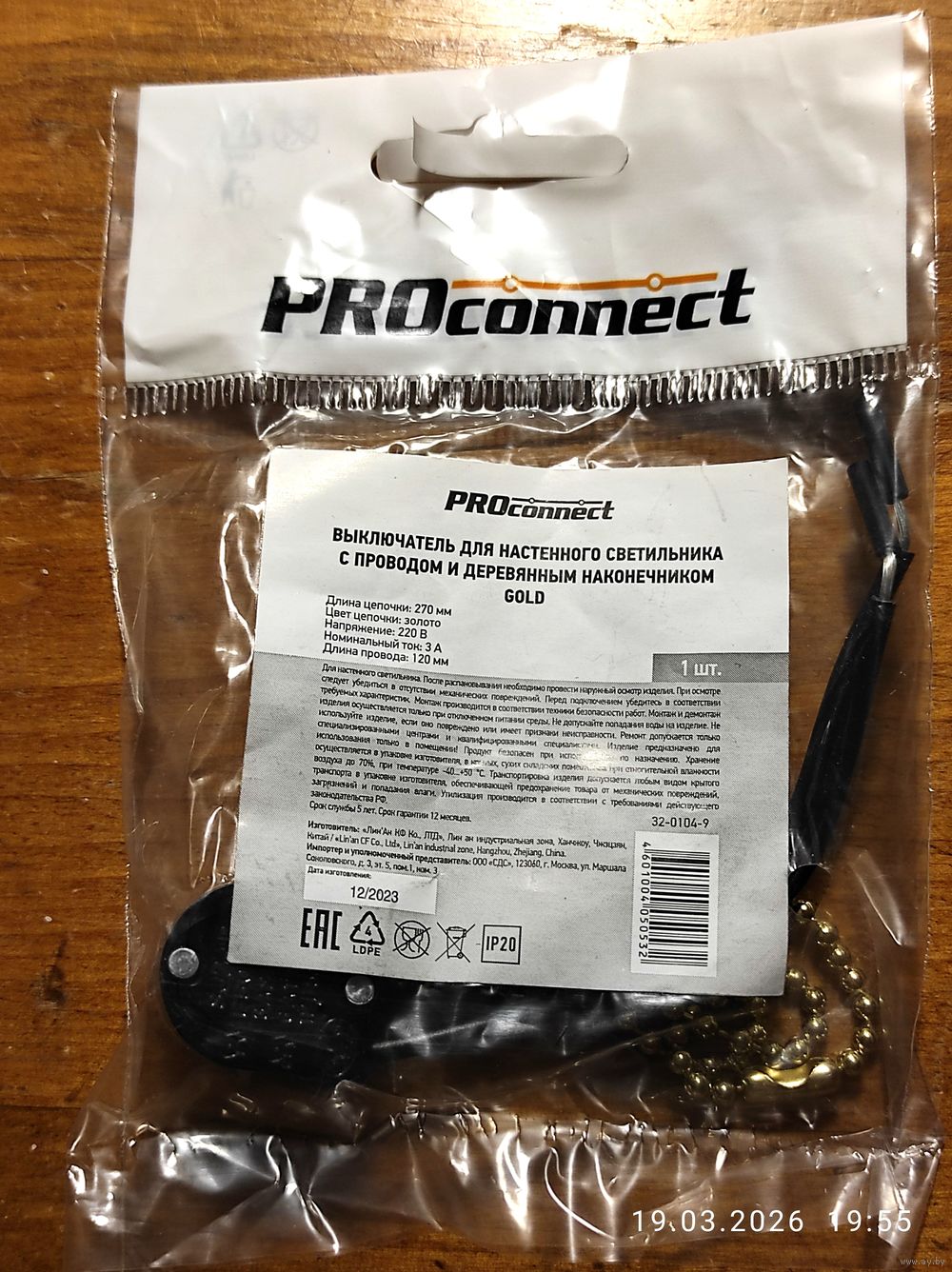Выкл-дергалка для бра с проводом и цепочкой 270мм золото