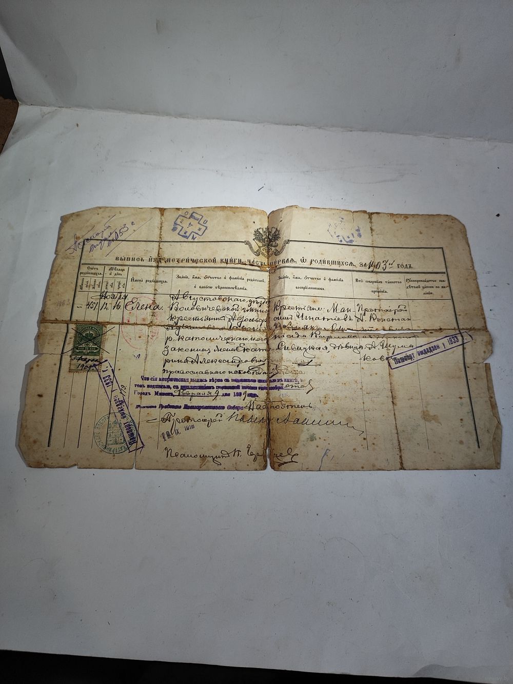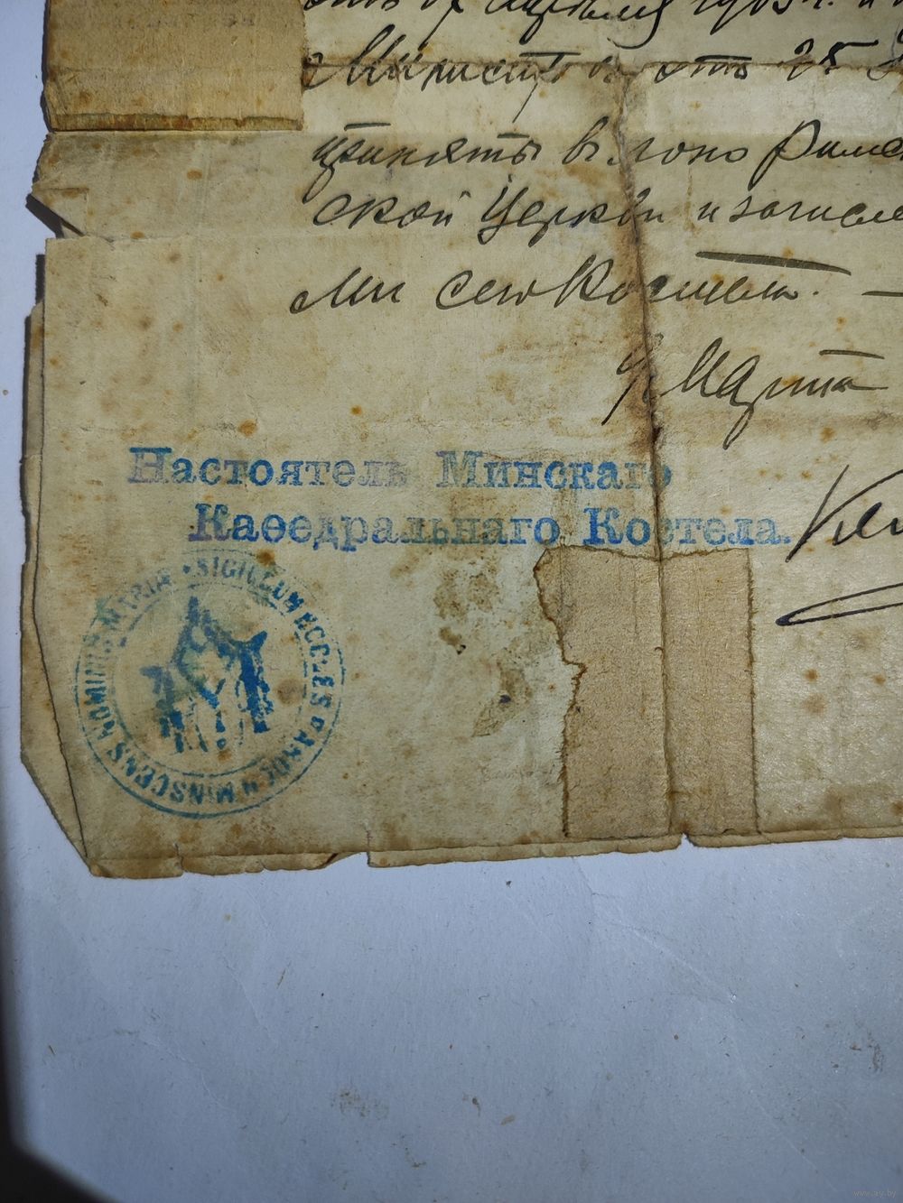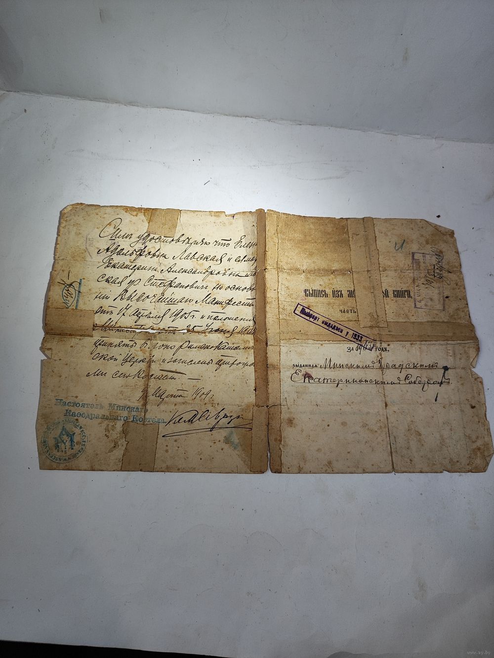 Выдан Минским городским Екатерининским Собором. Интересные печати,марка. Состояние на фото(подклеен , пятна, надрывы).