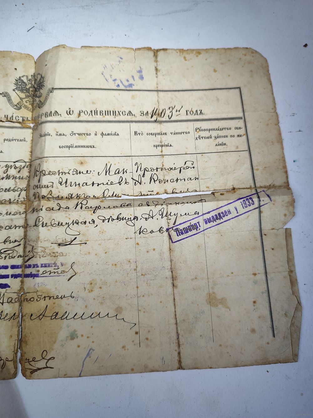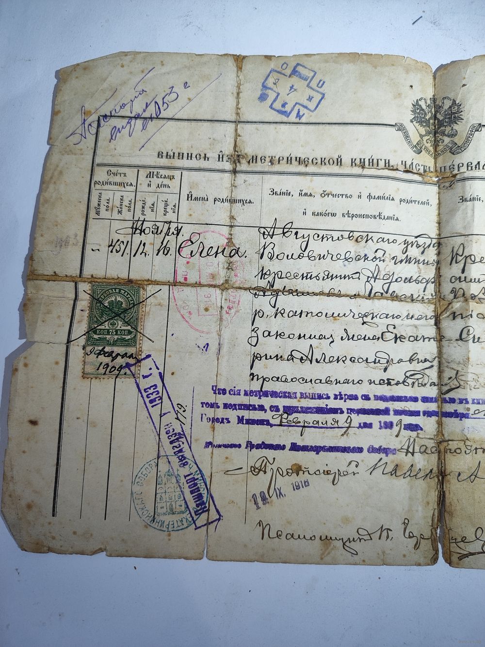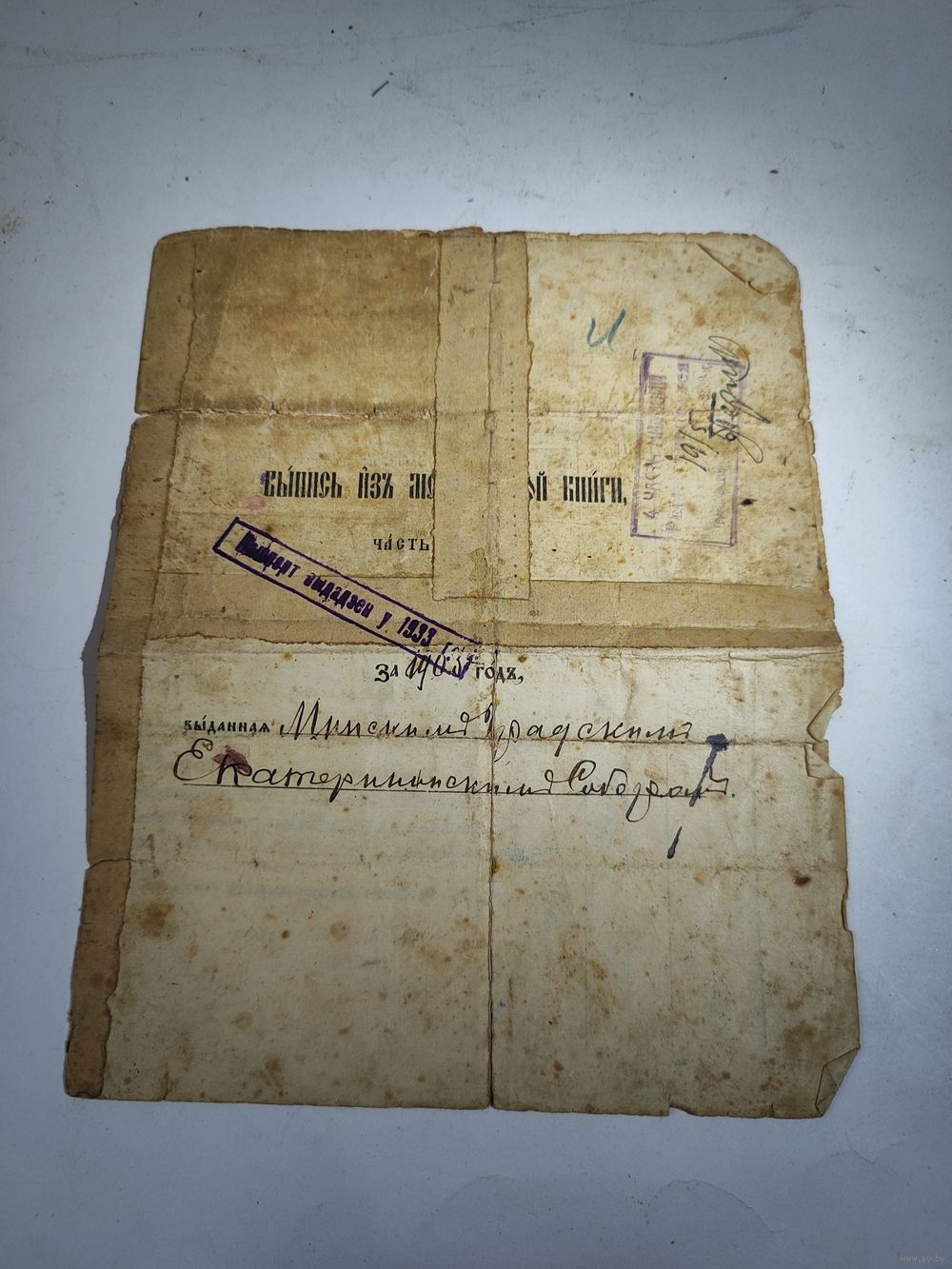 Выдан Минским городским Екатерининским Собором. Интересные печати,марка. Состояние на фото(подклеен , пятна, надрывы).