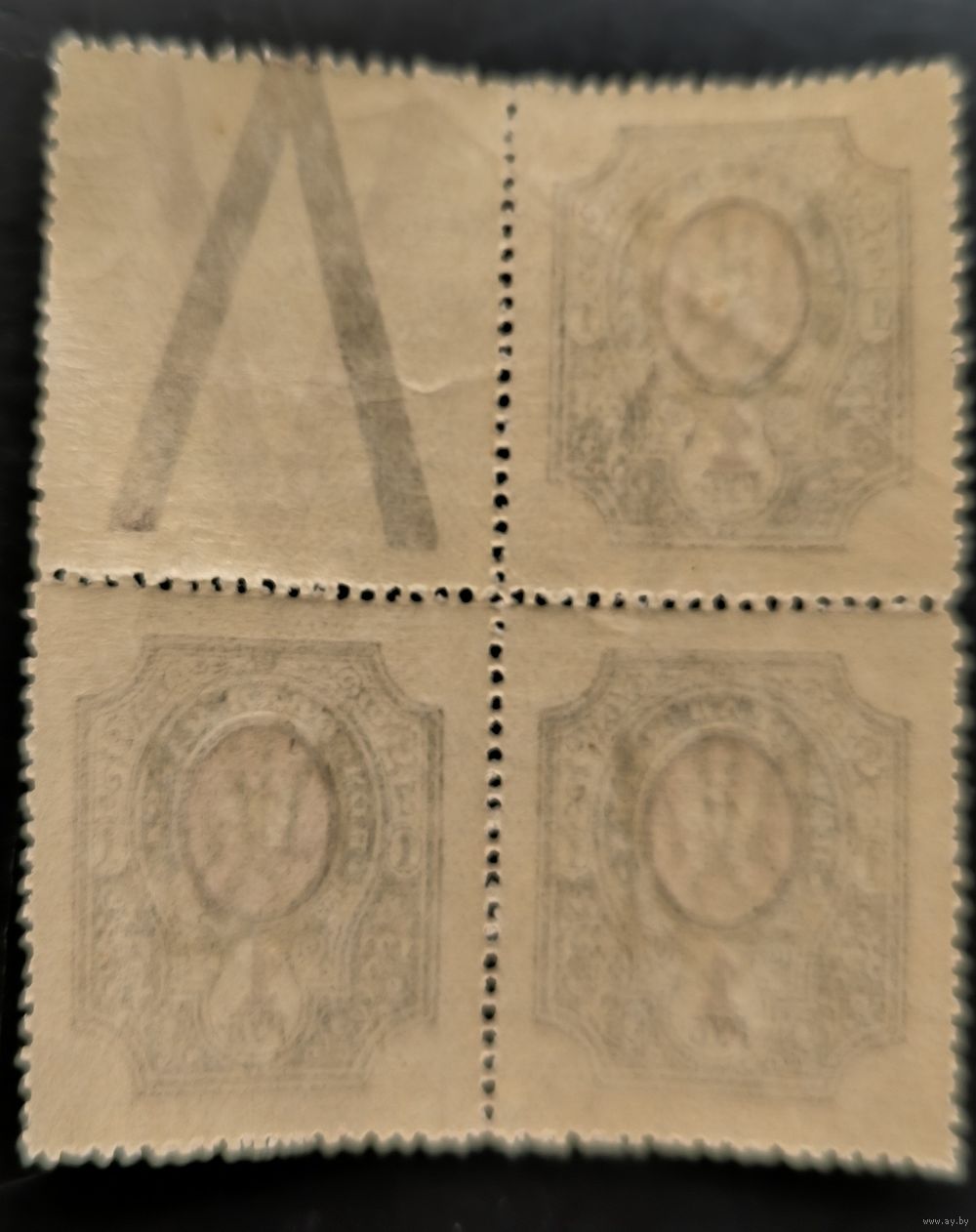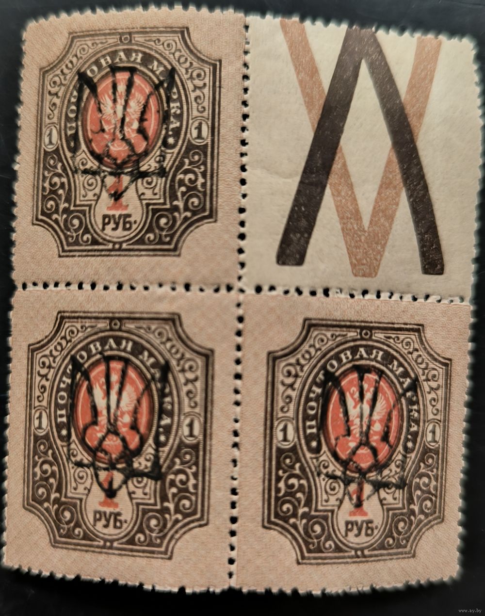 Выпуск Украинской державы. 1918г. (Одесса-5). Средний раструб. № 107. 1 руб. Квартблок с жуком.