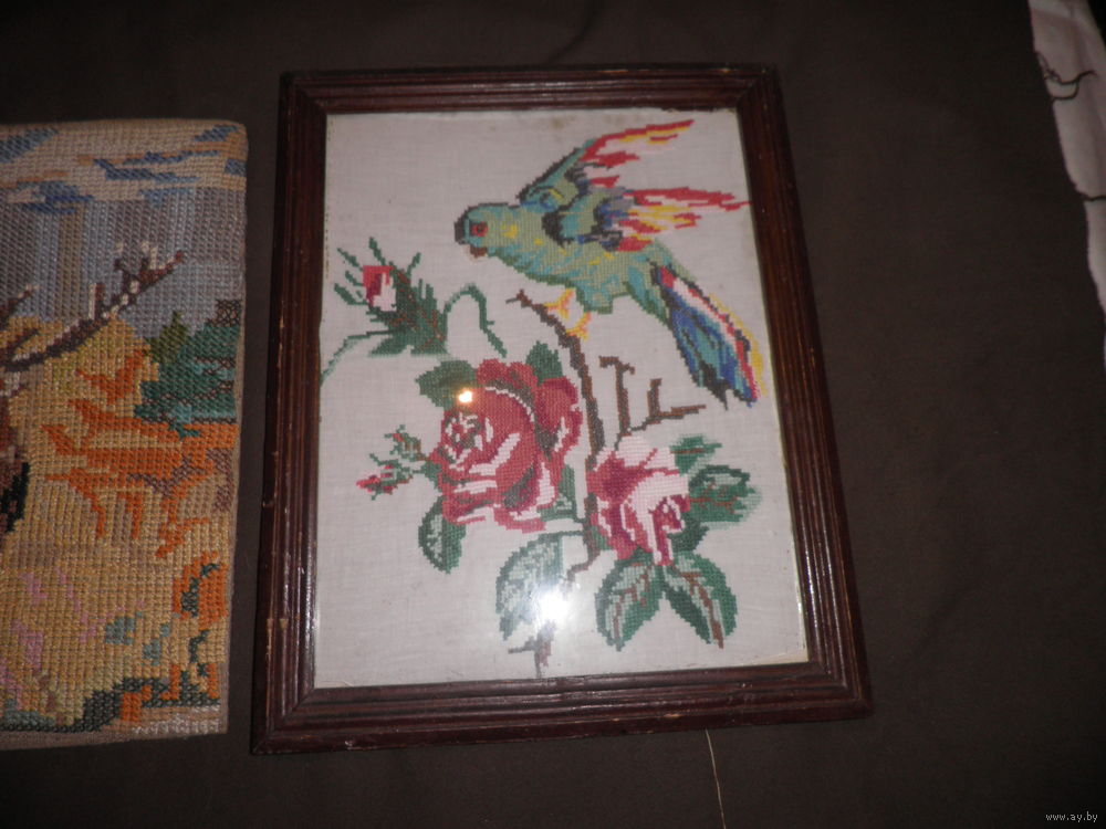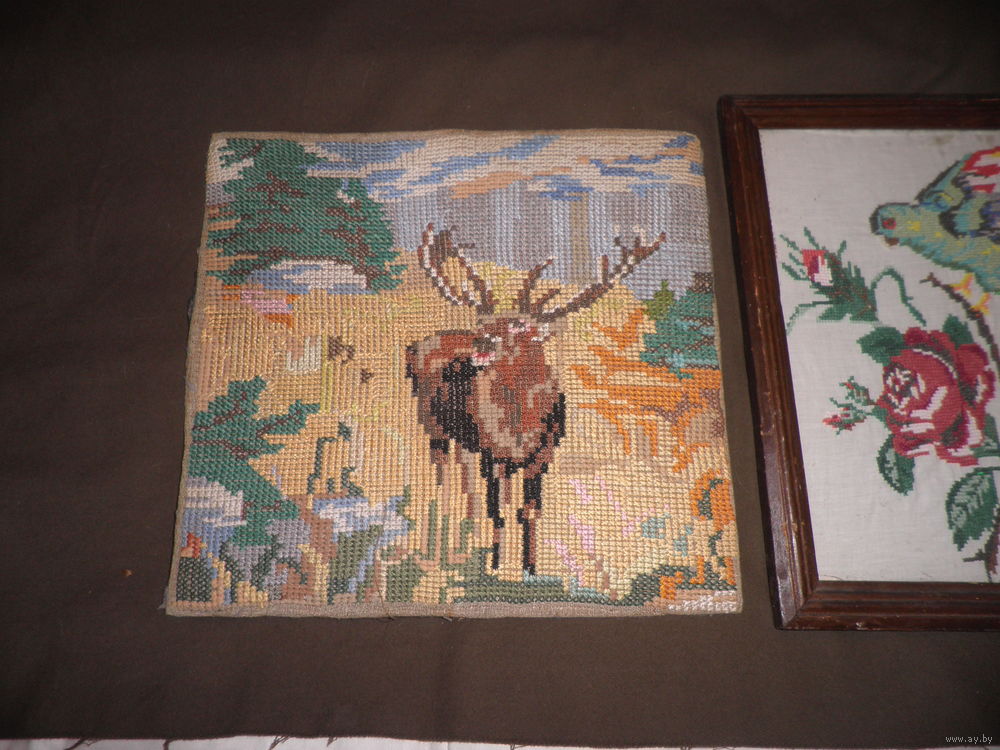 Вышивки на ткани Попугай и Олень старинные 40-50-е г.С рубля.
