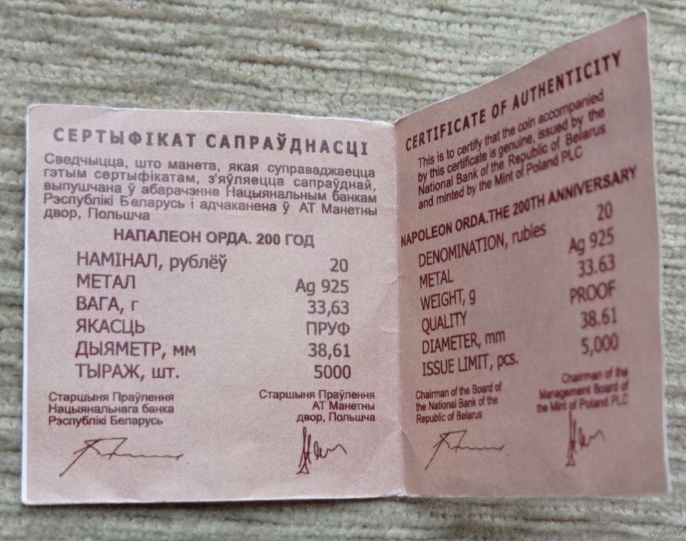Werty71 Беларусь 20 рублей 2007 серебро сертификат Напалеон Орда 200 лет