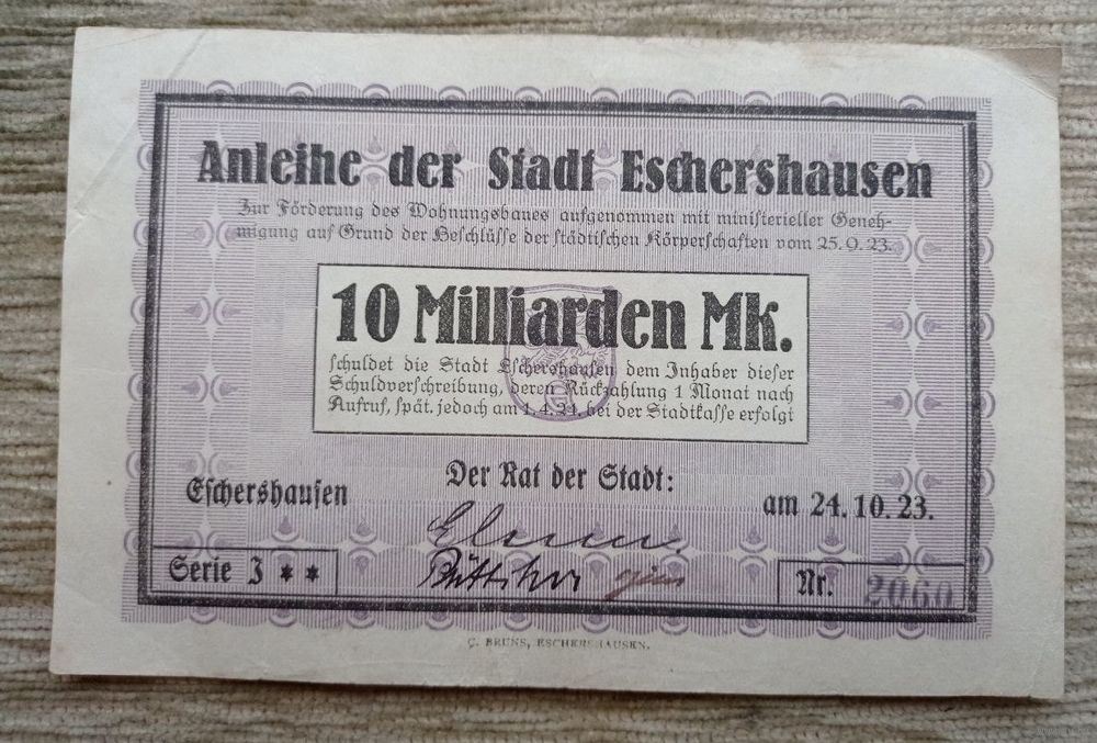 Werty71 Германия 10 миллиардов марок 1923 банкнота Гроссгельд Эшерсхаузен Нижняя Саксония