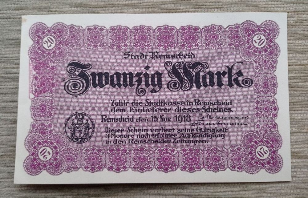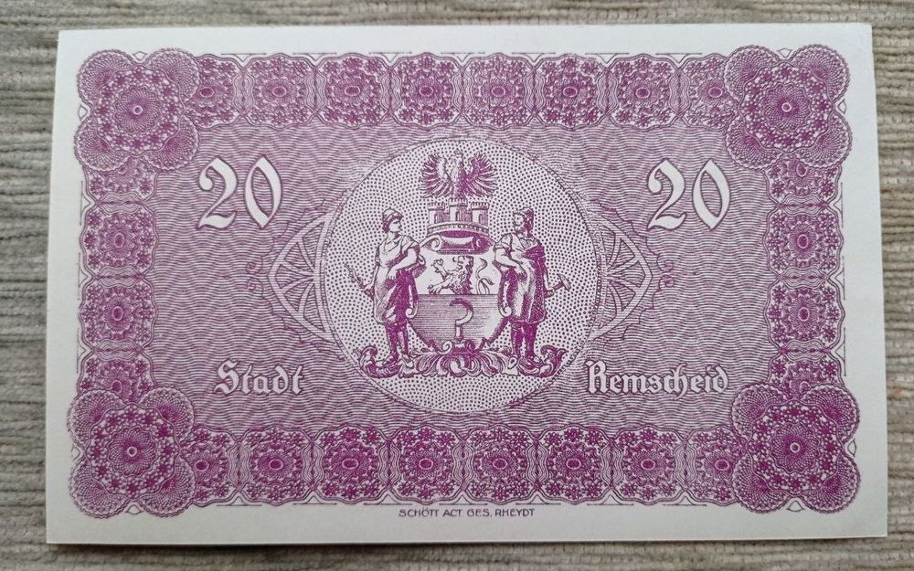Werty71 Германия 20 марок 1918 aUNC банкнота РЕМШАЙД