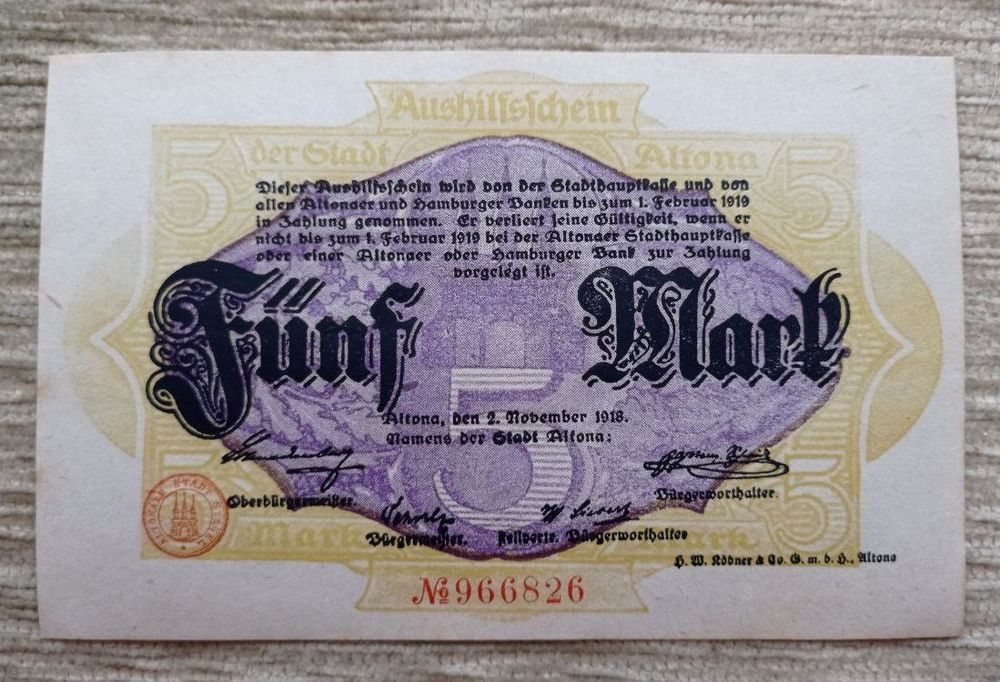 Werty71 Германия 5 марок 1918 аUNC банкнота Альтона