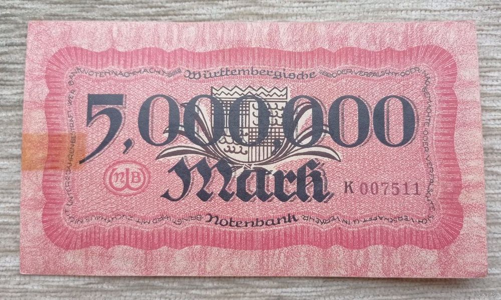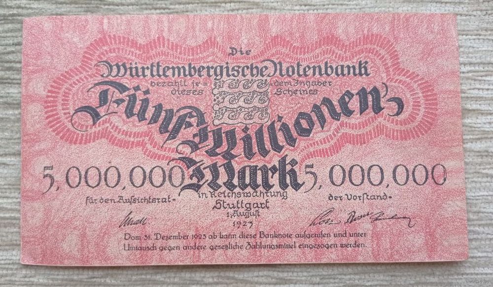 Werty71 Германия 5 миллионов 5000000 марок 1923 Заемный Банк Вюртемберга Штутгард 5 000 000 банкнота гроссгельд