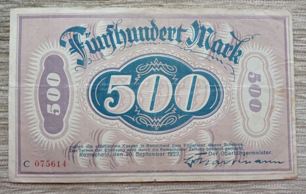 Werty71 Германия 500 марок 1922 банкнота Гроссгельд Ремшайд