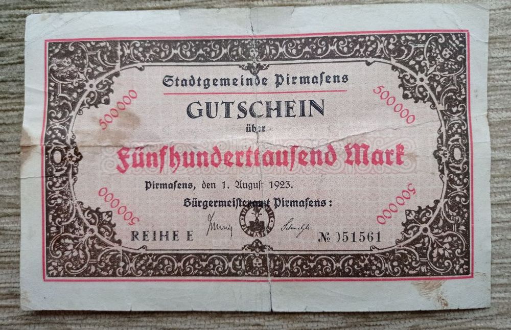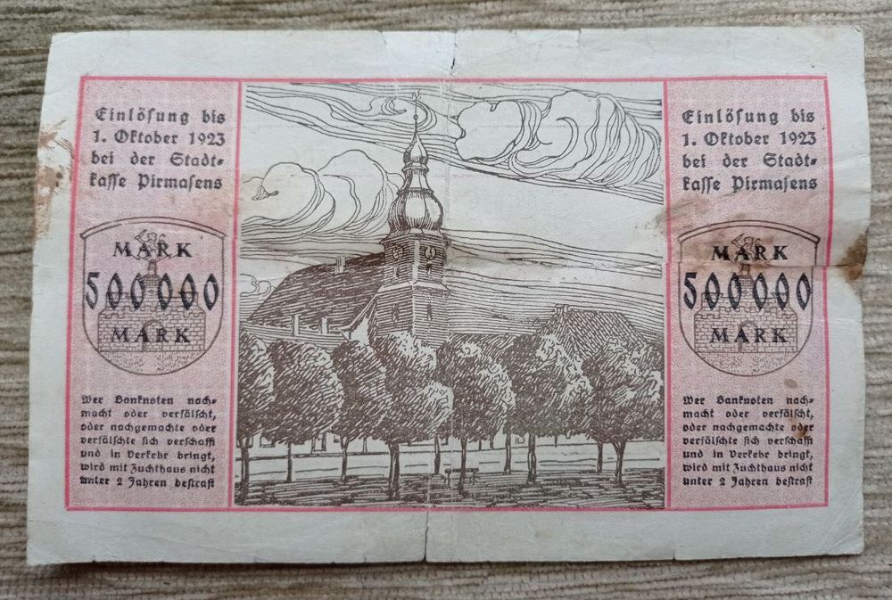 Werty71 Германия 500000 марок 1923 банкнота Гроссгельд городская община г Пирмарзенс редкая