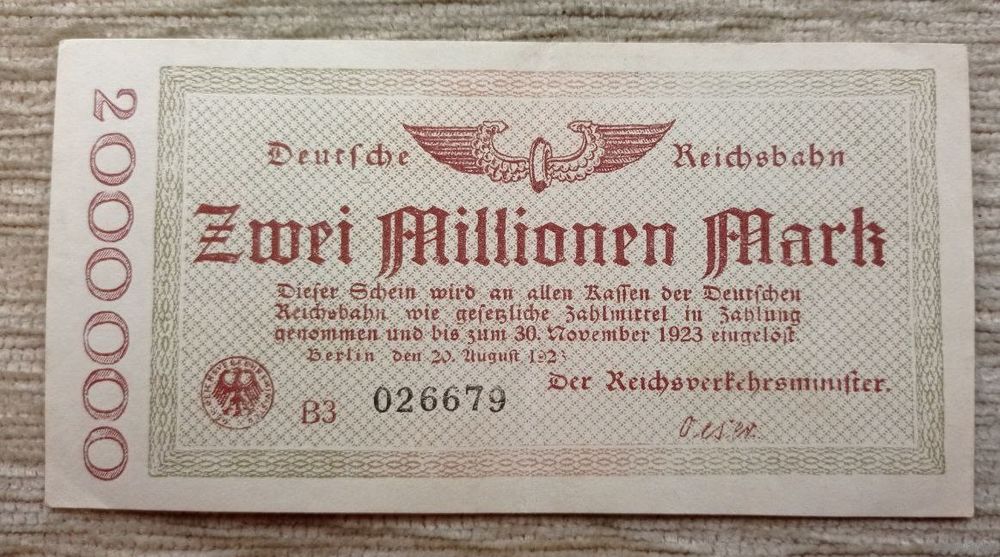 Werty71 Германия Веймар 2000000 марок 1923 банкнота 2 миллиона гроссгельд Берлин Железные дороги