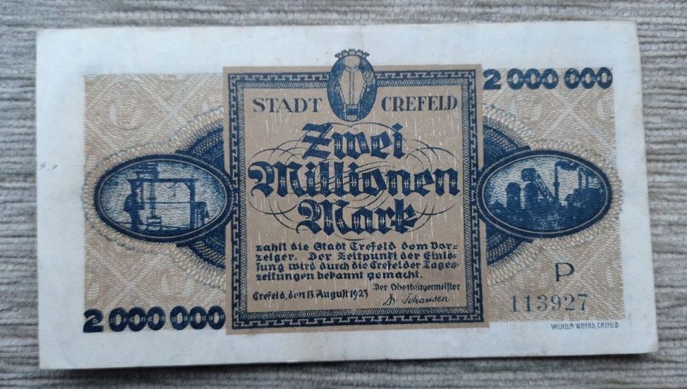 Werty71 Германия Веймар 2000000 марок 1923 банкнота 2 миллиона гроссгельд Крефельд