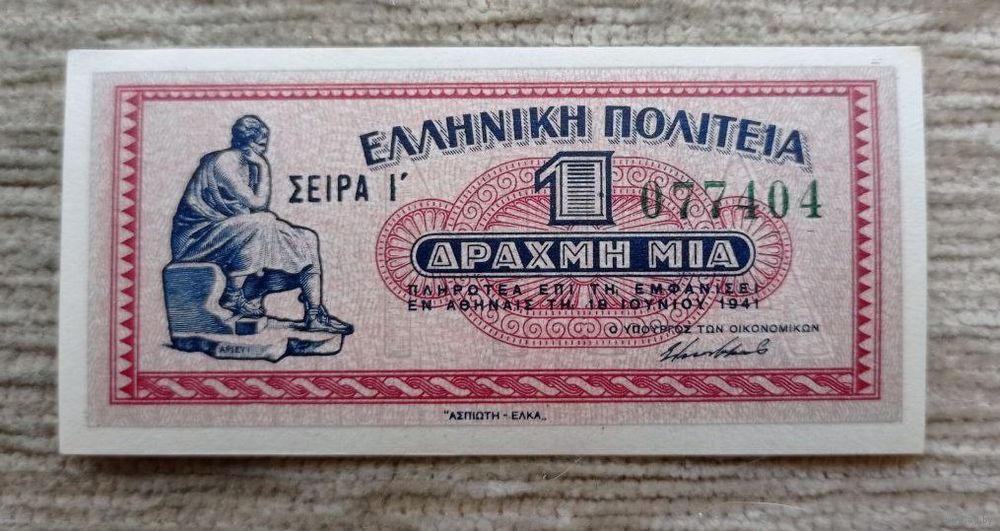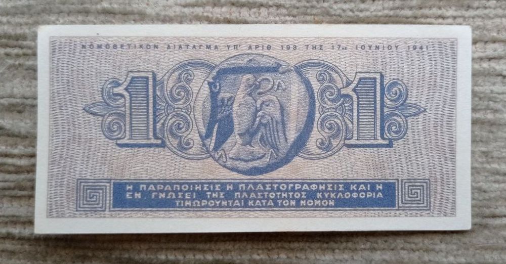 Werty71 ГРЕЦИЯ 1 ДРАХМА 1941 UNC банкнота