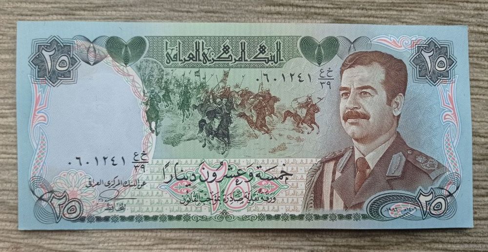Werty71 Ирак 25 Динаров 1986 Саддам Хусейн аUNC банкнота Всадники Памятник шехидов